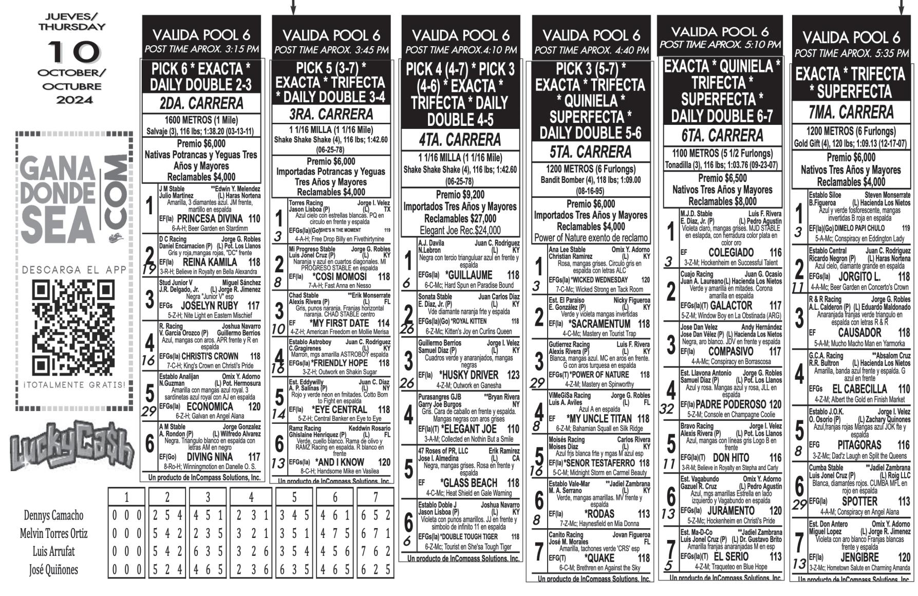 En el resto de las carreras válidas para el Pool de seis, en la segunda recomendamos a Reina Kamila, Christi’s Crown y Económica. En la tercera incluímos a Cosi Momosi, Eye Central y And I Know. Mientras, para la cuarta carrera nuestro cuadro incluye a Royal Kitten, Husky Driver y Double Tough Tiger.