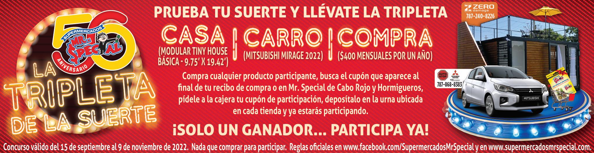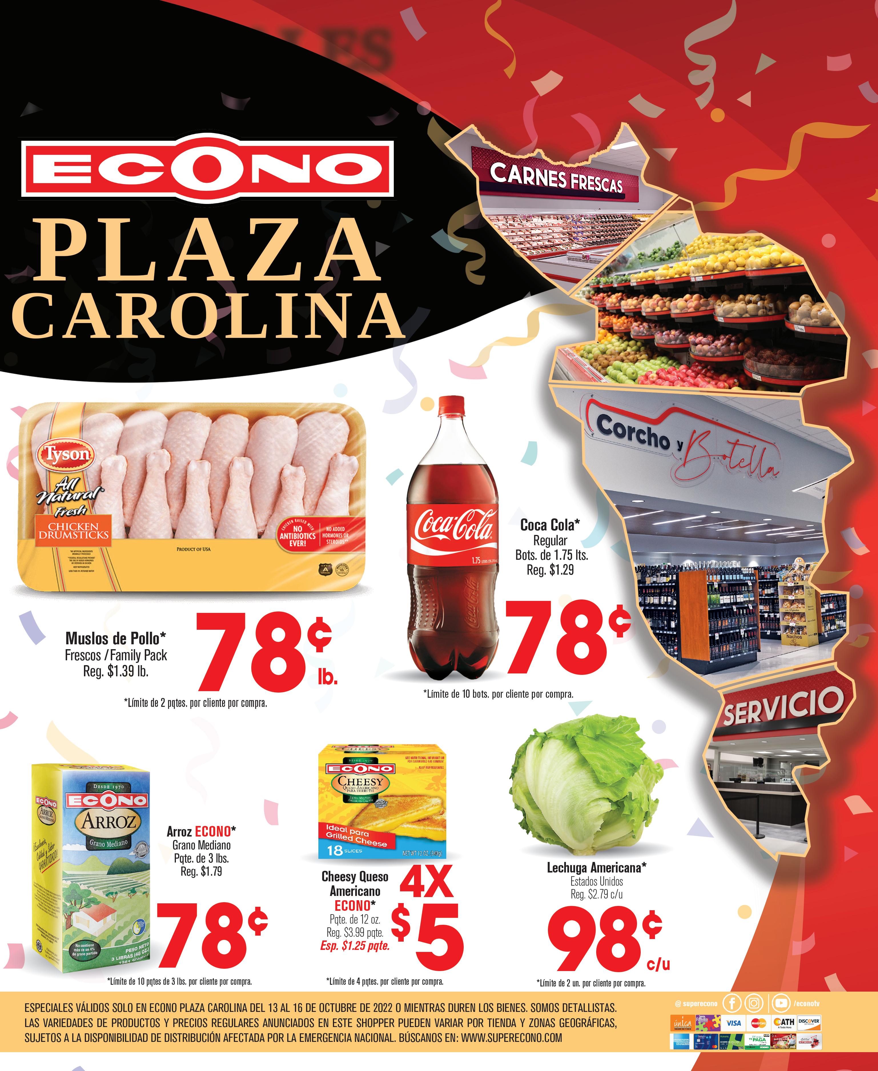 PARTICIPA Podrías ganar: COMPRA GRATIS POR UN AÑO GASOLINA GRATIS POR UN AÑOEN EFECTIVO $15,0001 Premio 1 Premio1 Premio EN EFECTIVO $25,0001 Premio Ford Mustang Mach-E Premium 2022 1 Premio Ford Explorer XLT 2022 1 Premio Concurso válido del 13 de octubre al 23 de noviembre de 2022. Son elegibles para participar todas las personas residentes de Puerto Rico que sean mayores de 18 años. Este sorteo está limitado al área geográfica de Puerto Rico. Promotor: Supermercados Econo, Inc. Nada que comprar para participar. Los premios están sujetos a las restricciones establecidas en las reglas de este Concurso. El color del vehículo puede variar sujeto a disponibilidad. Para más detalles y reglas visita: www.aniversarioecono.com Para más detalles y reglas del concurso accede al código QR. Celebrando52Aniversario nuestro @ superecono /econotv HORARIOS VARÍAN POR TIENDA. **SVT = SURTIDO VARÍA POR TIENDA. ESPECIALES VÁLIDOS DEL 13 AL 19 DE OCTUBRE DE 2022 O MIENTRAS DUREN LOS BIENES. SOMOS DETALLISTAS. LAS VARIEDADES DE PRODUCTOS Y PRECIOS REGULARES ANUNCIADOS EN ESTE SHOPPER PUEDEN VARIAR POR TIENDA Y ZONAS GEOGRÁFICAS, SUJETOS A LA DISPONIBILIDAD DE DISTRIBUCIÓN AFECTADA POR LA EMERGENCIA NACIONAL. BÚSCANOS EN: WWW.SUPERECONO.COM Tarjeta Familia *Límite de 10 lbs. por cliente por compra. *En su empaque original *Límite de 2 pqtes. por cliente por compra. *Límite de 2 pqtes. por cliente por compra. 158 19 98lb. pqte. *Límite de 4 pqtes. por cliente por compra. *Límite de 4 pqtes. por cliente por compra. *Límite de 8 envs. por cliente por compra.*Límite de 5 latas por cliente por compra. *Límite de 4 pqtes. por cliente por compra.*Límite de 6 envs. por cliente por compra.*Límite de 6 pqtes. por cliente por compra. *Límite de 4 pqtes. por cliente por compra.*Límite de 10 pqtes. de 3 lbs. por cliente por compra. Costillas de Cerdo “Soft Bone” La Herencia* Frescas / Estados Unidos Reg. $2.99 lb. Muslos con Caderas de Pollo* Cong. / Estados Unidos Pqte. de 10 lbs. Reg. $8.99 pqte. Esp. $6.80 pqte. Alitas o Drummettes de Pollo Ariztía* Cong. / Chile Pqte. de 10 lbs. / SVT** Reg. $28.99 pqte. 10 lbs. *Límite de 10 lbs. por cliente por compra. 298 lb. Fresco Arroz ECONO Grano Mediano Pqte. de 3 lbs. Reg. $1.59 c/u Esp. $1.00 c/u Chef Boyardee Spaguetti con Albóndigas, Beefaroni o Beef Ravioli, SVT** Lata de 14.5 ó 15 oz. Reg. $1.69 c/u Esp. $1.00 c/u 5X $5 Handy Pack Kellogg’s Corn Flakes o Frosted Flakes, SVT** Pqte. de 6 un. Reg. $2.99 pqte. Esp. $1.67 pqte. 3X $5 Cerveza Medalla Light Pqte. de 12 latas de 10 oz. Reg. $10.99 798 Papas Roja o Amarilla Canadá / Pqte. de 5 lbs., SVT** Reg. $3.99 pqte. Esp. $2.50 pqte. 2X $5 5X $5