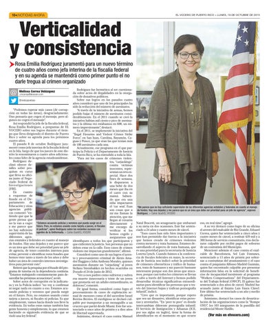 Rodríguez fue hermética al ser cuestionada sobre actos de ilegalidades en la otorga>mcorrea@elvocero.com ción de donativos políticos. Sobre sus logros en los pasados cuatro @melissaivelisse años consideró que uno de los principales ha sido la reducción del número de asesinatos. “Podemos esperar más casos (de corrup“A través de la iniciativa de armas, hemos ción en todas las áreas), desgraciadamente. podido bajar el número de asesinatos consiUno pensaría que cogen el mensaje, pero al- derablemente. En el 2011 cuando se creó la gunos no cogen el mensaje”. iniciativa habían mil ciento y pico de asesinaAsí respondió la jefa de la fiscalía federal, tos y la última vez estábamos en 600, un núRosa Emilia Rodríguez, a preguntas de EL mero impresionante”, destacó. VOCERO sobre sus logros durante el tiemEn el 2011, se implementó la iniciativa del po que lleva dirigiendo el distrito de Puerto “Ilegal Firearms and Violent Crimes Strike Rico y sobre su agenda para los próximos Force”, en San Juan, Carolina, Bayamón, Cacuatro años. guas y Ponce, ya que eran las que tenían más El pasado 8 de octubre Rodríguez jura- de 100 asesinatos cada una. mentó como jefa interina de la fiscalía federal Actualmente, ese programa en el que paren la Isla, luego de que los jueces de este dis- ticipa la Policía y el Departamento de Justicia trito la renominaron a cuatro años adiciona- de Puerto Rico, se ha extendido a toda la Isla. les como líder de la agencia estadounidense. “Para mí los casos de crímenes violenRodríguez detos, “carjackings” clinó ofrecer decontra víctimas talles sobre pesinocentes, reprequisas en curso sentan un reto esque lleva su oficipecial. Hace dos na junto al Negofines de semana, ciado Federal de le dispararon a Investigaciones una bebé de dos (FBI). meses que iba en En cuanto el carro con su a esquemas de mamá. Sabienfraude en el Dedo que era una partamento de niña impactaron Educación y otras el ‘car seat’. Esas agencias públison cosas que a cas comentó “enmi me llaman la tiendo que que la atención, que me gente piensa que llegan al corazón no la van a coger “Estamos acusando policías y veremos qué pueda surgir en el directamente y y me parece que futuro. Pero, no estamos usando como tarjeta a jueces, ni fiscales me encargo de no hay suficiente ni policías”, opinó Rodríguez sobre los recientes sucesos con verificar si los supervisión de las agentes de la Uniformada. > Carlos Giusti/EL VOCERO hemos cogido y diferentes agenasegurarnos que cias estatales y federales en cuanto al manejo identifiquen a todos los que participaron y de fondos. Hay una dejadez y me parece que que enfrenten la justicia. Son personas que no es un área que debe ser prioridad para un jefe deben estar en la calle. Esos casos de crimen de agencia, de tener controles internos para violento me impactan grandemente”, afirmó. evitar, prevenir o identificar estos fraudes que Consideró como uno de sus logros el arreshemos visto tanto a través de los años y debe to y procesamiento criminal de Alexis Amahaber un área de controles internos investiga- dor Huggins y John Anthony Morales, quienes tivos para prevenir esto”. asesinaron durante un “carjacking” al joven Reiteró que la pesquisa por el fraude del pro- Stefano Steenbakker en hechos ocurridos en grama de tutorías en la dependencia continúa. Dorado el 24 de junio de 2012. “Estamos trabajando constantemente para de“Ver a esos padres como sufrieron y sufren sarrollar las próximas acusaciones”, acotó. esa muerte innecesaria y triste de un joven Sobre actos de corrupción en la judicatu- que prometía ser un adulto extraordinario, es ra y en la Policía indicó “no voy a confirmar doloroso”, comentó. ni negar nada en cuanto a eso. Estamos acuDe igual forma, consideró como logro el sando policías y veremos qué pueda surgir procesamiento de casos de explotación seen el futuro. Pero, no estamos usando como xual de menores como el del sacerdote Israel tarjeta a jueces, ni fiscales ni policías. Es que Berríos Berríos. El exreligioso se declaró culsimplemente, vamos hacia donde nos lleve la pable por transportar a un monaguillo a un evidencia. En todas estas ramas también hay crucero que partió desde Miami. Este fue sengente honesta y simplemente, lo que estamos tenciado a once años de prisión y a diez años haciendo es siguiendo evidencia de que se de libertad supervisada. violó una ley federal”. Asimismo, destacó el caso contra Manuel
