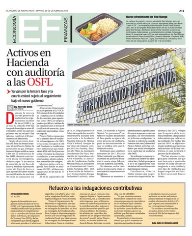 otros. De acuerdo a Pizarro Núñez, “es prematuro” establecer cuánto finalmente el fisco puede recuperar de estos procesos de auditoría, pues no necesariamente lo que se notifica es lo que finalmente cobra. Entretanto, para el primer trimestre de 2017, Pizarro Núñez entiende que Hacienda estaría en posición de iniciar la cuarta etapa del proceso de auditoría a las OSFL. No obstante, no fue categórico si esta cuarta etapa se concentrará mayormente en las iglesias. “Haremos un muestreo e