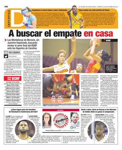 Leo Arill: Cierto. Yamaira Muñiz: Porque tú tenías No cabe la menor a un núcleo que duda que son había crecido, y los favorihabía ganado tos (no un campeoamplios) nato y un por dos subcamrazo@yamairamuniz peona@leoarill nes to, y que para Yamaira Muñiz y Leo Arill > EL VOCERO DE PUERTO RICO son esta más temque suporaficientes: LeBron James y los defensores da se cambió todo. Los Warriors del título. Pero J.R. Smith es una interroapostaron todo a un jugador valioso gante y los rivales, como Boston, Toronto o como lo es Kevin Durant. Así que si Indiana, se han fortalecido. Ojo. Ahora los Cavs no ganan, todo lo que hicieron fue son más previsibles que nunca. un error.