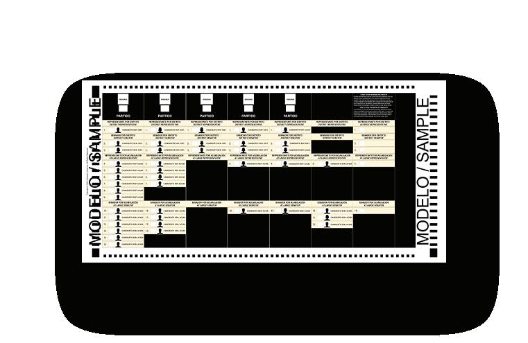 candidatura Para votar por candidaturas, insignia. Usted va a buscar los candidatos uno a uno por el máximo que tenga derecho. En la legislativa, que sería la (papeleta) más complicada, pues solo puede votar por un representante por distrito, dos senadores por distrito, uno por acumulación senado y uno por acumulación representante. En la estatal es fácil: un gobernador y un comisionado residente. En la (papeleta) municipal, igual”, explicó Conty Pérez.