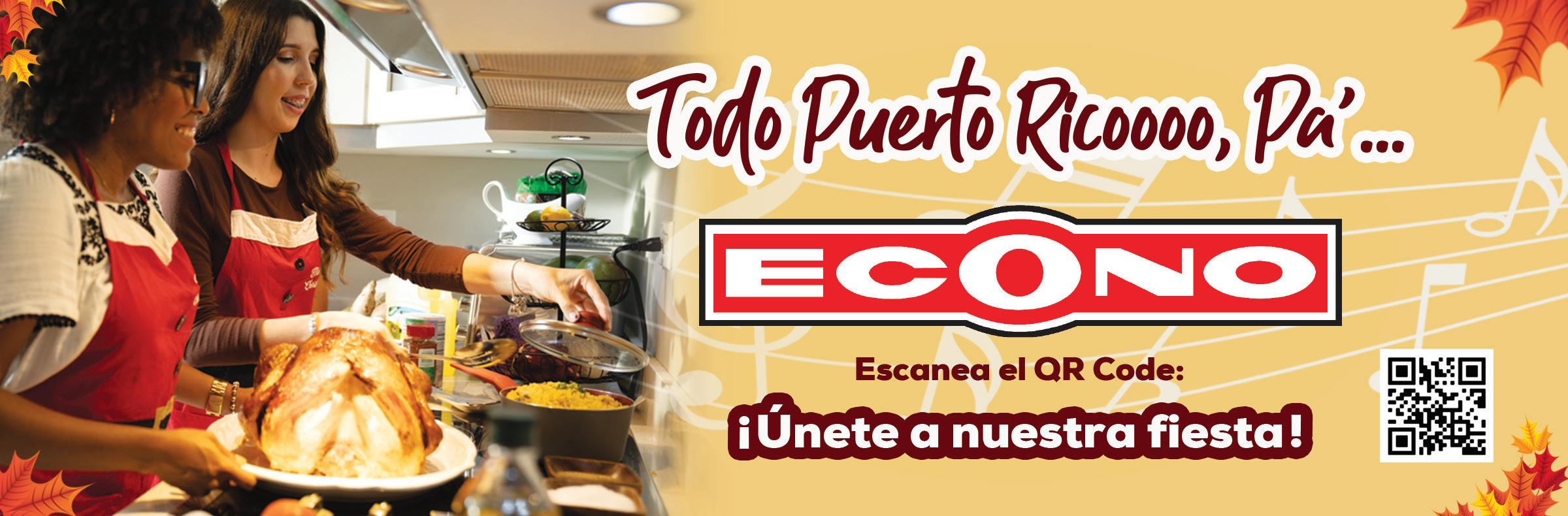Mini Jamón Serrano Nico De España Deshuesado, Caja de 2.2 lbs. aprox. Kit incluye cuchillo y picador Reg. $39.99 c/u Cerveza Coronita Extra Caja de 12 bots. de 7 oz. Reg. $13.99 Vino Izadi Reserva Bot. 750 ml. Reg. $14.99 Vino Santiago Ruiz Albariño Bot. de 750 ml. Reg. $20.99 Vodka Grey Goose Variedad, SVT** Bot de 750 ml. Reg. $36.99 c/u 998 Luca Paretti Prosecco o Rose, SVT** Bot. de 750 ml. Reg. $12.99 c/u Dewar’s Caribbean Smooth 8 Años Bot. de 750 ml. Reg. $24.99 Dewar’s 15 Años Bot. de 750 ml. Reg. $40.99 Dewar’s 12 Años Bot. de 750 ml. Reg. $29.99 Pernil de 7 lbs. (antes de asar) 5 lbs. de Arroz Rico con Gandules 3 lbs. de Ensalada de Coditos 12 panecillos Pan Pepín 1 Bizcocho de Vainilla o Chocolate 2 Coca-Cola o Sprite de 1.75 lts. Cena para 10 a 15 personas. 5995 7995 Para más detalles comunícate con tu Deli Econo favorito. Pavo de 14 a 16 lbs. (antes de asar) 5 lbs. de Arroz Rico con Gandules 3 lbs. de Ensalada de Coditos 12 panecillos Pan Pepín 1 Bizcocho de Vainilla o Chocolate 2 Coca-Cola o Sprite de 1.75 lts.