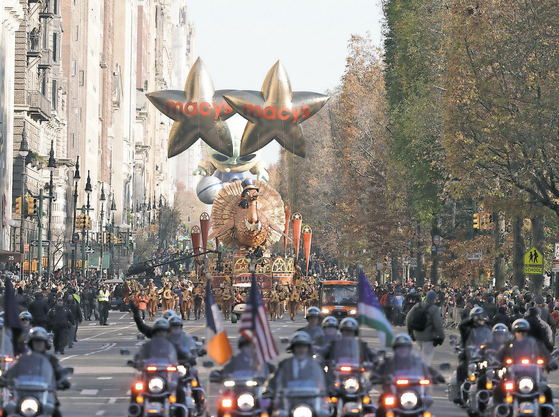 The Tom Turkey float leads the way down Central Park West during the Macy’s Thanksgiving Day Parade, Thursday, Nov. 24, 2022, in New York. >AP Photo/Jeenah Moon