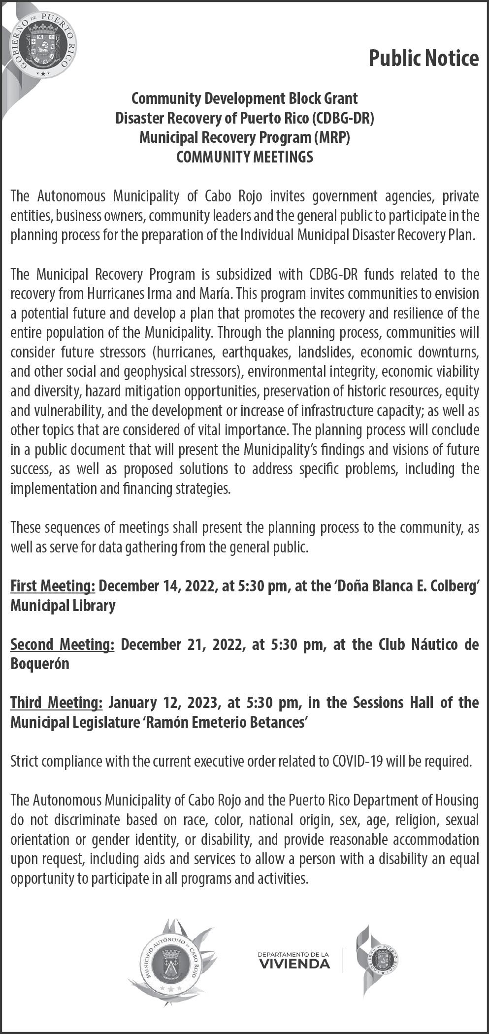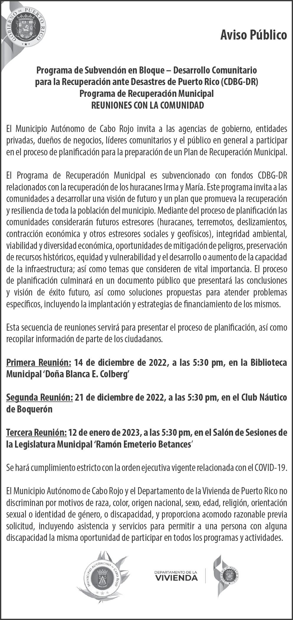 “Ayer, (lunes) FEMA nos confirmó que los últimos tres municipios que falta ban para entrar a la decla ración de desastre mayor de obra permanente bajo Fiona entraron... que faltaban Culebra, Vieques y Loíza. Así que, con esto, los 78 municipios están en todos los aspectos de la Declara ción de Desastre Mayor de Fiona; o sea, en los trabajos de obra de emergencia, en los programas de asistencia individual, en los progra mas de mitigación de riesgo y ahora en los proyectos de obra permanente”, detalló Laboy.