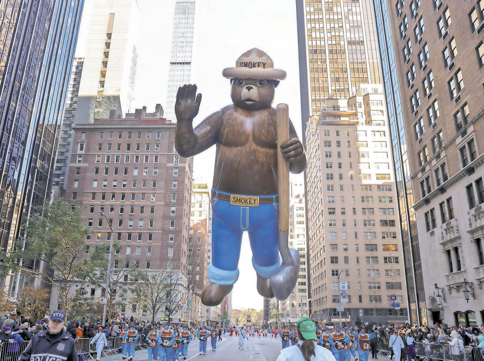 Handlers pull the Smokey Bear balloon down Sixth Avenue during the Macy’s Thanksgiving Day Parade, Thursday, Nov. 24, 2022, in New York. >AP Photo/Jeenah Moon