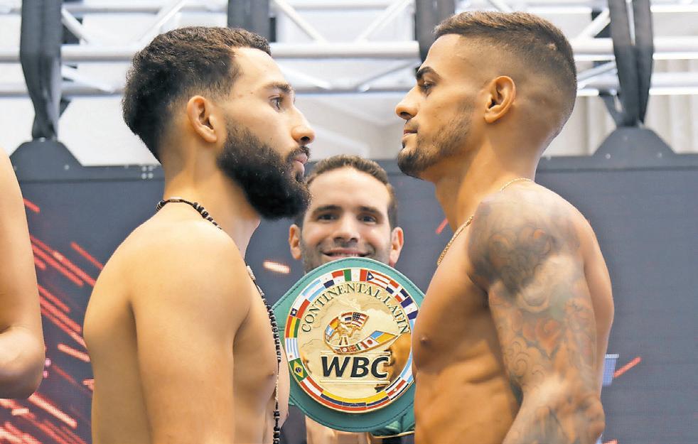 Carlos “Purin” Caraballo (der.) mira a su oponente José Sánchez durante el pesaje ayer. >Suministrada / Miguel Cotto Promotions