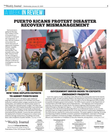 a week in review Puerto Ricans Protest Disaster Recovery Mismanagement Demonstrators gathered Monday and Tueday in front of the governor’s mansion to demand the resignation of Gov. Wanda Vázquez and protest the recent discovery of apparently forgotten disaster supplies amid ongoing earthquakes. The protests came a day after Vázquez fired former emergency management director Carlos Acevedo. Gov. Vázquez ordered an investigation into the incident. >Carlos Rivera Giusti