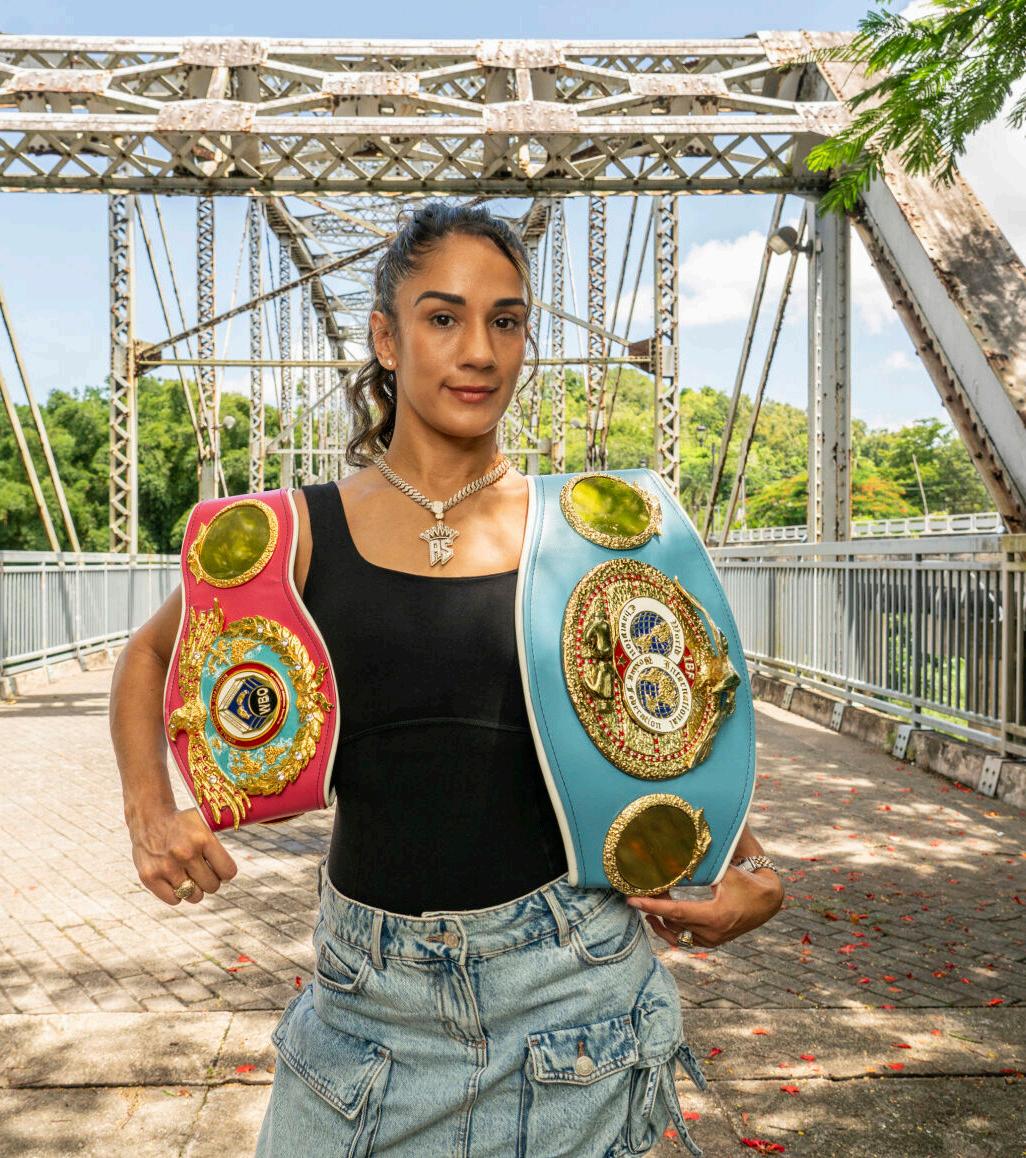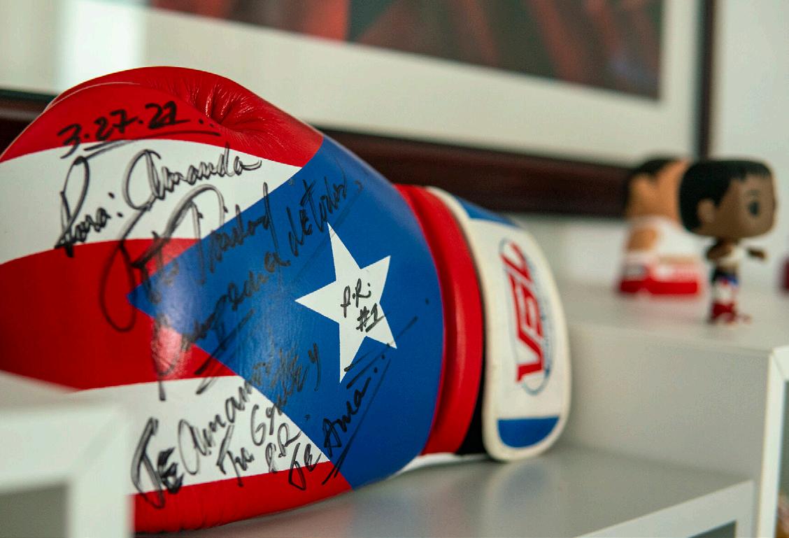 en un encuentro improvisado en su hogar, durante el que atendió a ZONA sentada en una silla dándole la espaldas a una gigantesca ilustración en la que se ve golpeando a la irlandesa Katie Taylor. Allí también tenía una especie de ‘museo’ con sus cinturones del Consejo Mundial de Boxeo (CMB) y de la Federación Internacional de Boxeo (FIB), así como medallas, pequeños muñecos –incluyendo uno alusivo al Team Rubio de béisbol– y un guante con la bandera de Puerto Rico firmado por el excampeón mundial Félix “Tito” Trinidad.