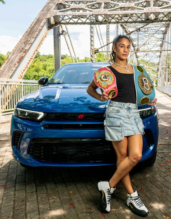 enjambre dentro de lo que llamamos el ‘Súper Avispón’. Así mismo; un avispón de mucha fuerza, es la mejor forma de describir al Modelo GT que nos prestó la familia Dodge. Detrás del volante estaba este servidor y, junto a mí, el editor de deportes, Giovanny Vega. Ambos fuimos a recoger a la campeona mundial Amanda Serrano, quien indiscuti blemente se ha ganado una de la presente portada. La boxeadora boricua, además de ser una superatleta, y ahora vecina del pueblo de los gigantes, es la portavoz de la campaña de este nuevo modelo. Es lógico; belleza y poder son atributos que