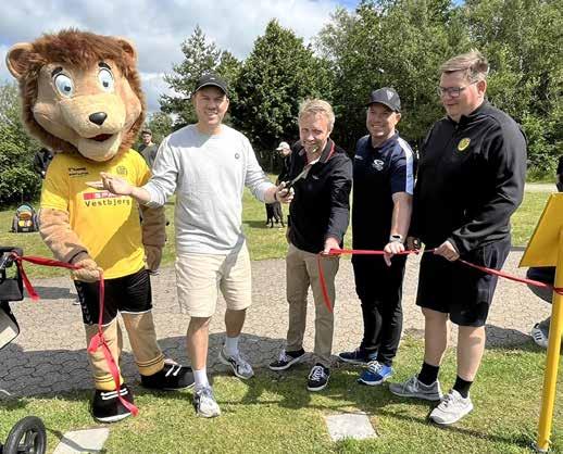 Så er den røde snor klippet. Fra venstre: Viffer, René Melvad Jørgensen, skoleleder Steffen Hessellund, Christian Spliid og formand for Vestbjerg IF Torben Carstensen.