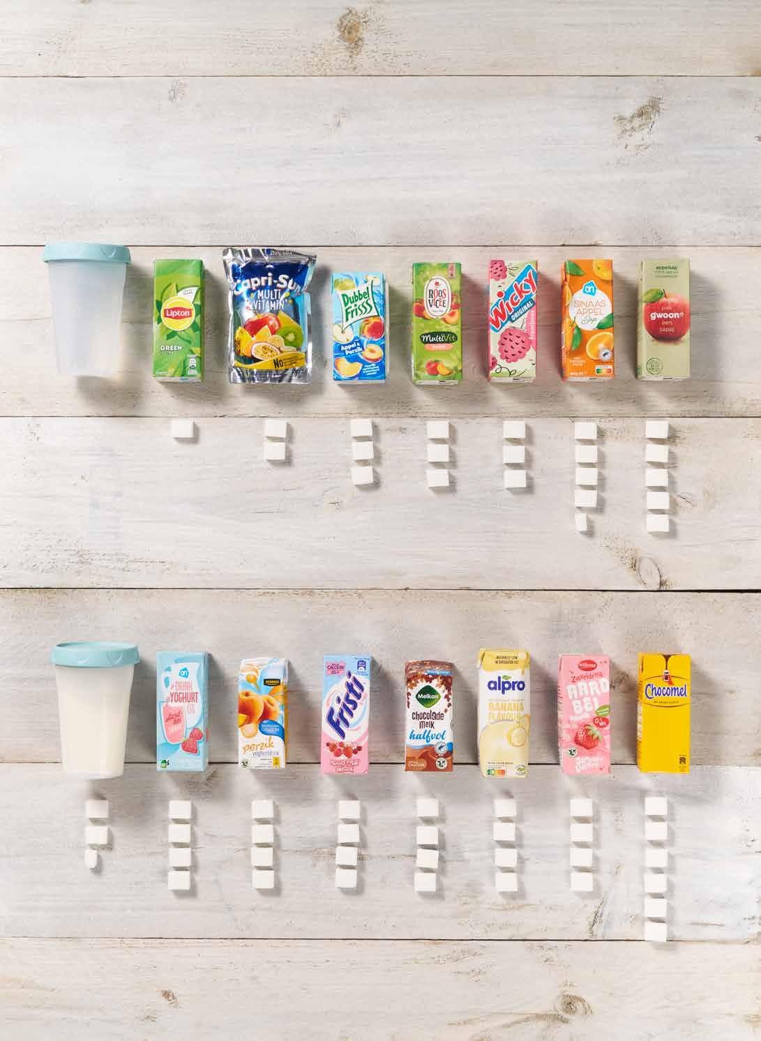 In veel dranken zit suiker. Een kind dat vaak frisdrank, gezoete yoghurtdrank, (dik)sap, aanmaaklimonade of chocolademelk drinkt, heeft meer kans op overgewicht. Ook zijn die drankjes niet goed voor de tanden. Kijk op www.voedingscentrum.nl/drinkenkind en kijk hoeveel suiker er in pakjes drinken zit. Meer voorbeelden? Kijk op www.voedingscentrum.nl/pakjesdrinken op basis van etiketinformatie april 2024