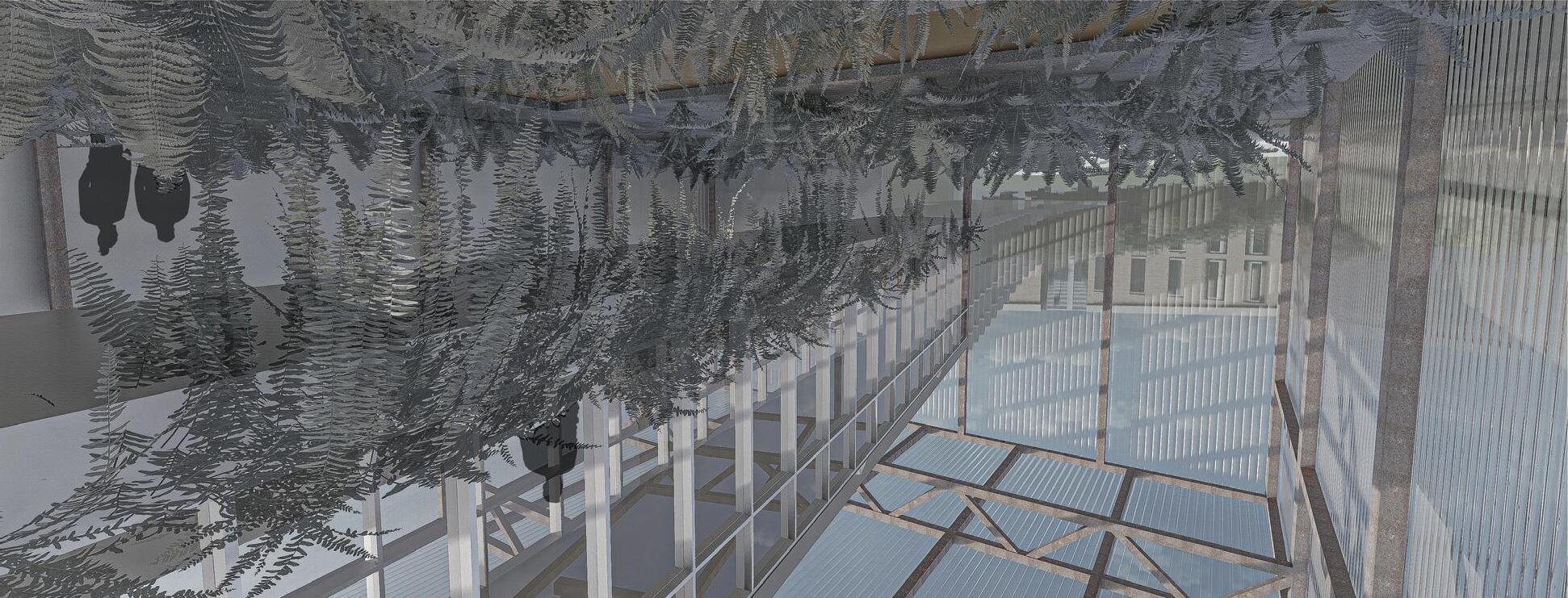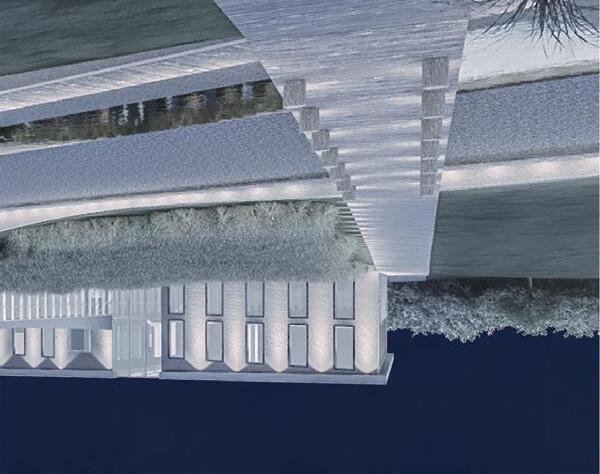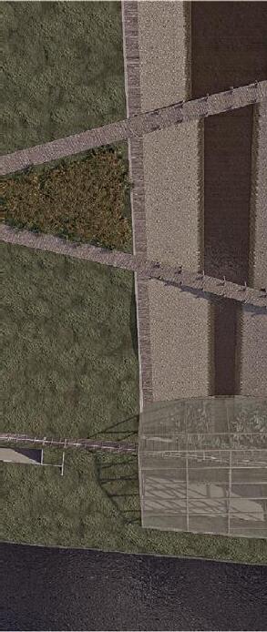 a new use. Punching into the berm on the f ar side of the site f rom the neighborhood, a linear structure connects Mcarthur Blvd on the east border to the previously inaccesibly trolley trail on the west. Instead of being boxed in by the berm, visitors interact with it. Walking through the pathway f rom the west entry, one goes throuygh a series of “moments” first in a bridge through a greenhouse, then through a research building. People are drawn into the site as well as able to access the resivior on the opposite side of the berm in a controlled manner through the building. The moment s created by the greenhouse and research building continue into the site in a canal and permeable paving, providing required f acilit ies for researchers as well as a foreshadowing the greenhouse exhibit and reservior beyond the berm to the public.