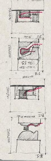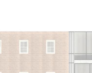 Located on the corner of a busy daytime commercial corridor, Route 1, and a walkway for college nightlife, Knox Road, Undulating Tunnel primarily focuses on serving two varying experiences. The side of the building facing Route 1 maintains the surrounding classical brick architectural lang uage and street edge, while a cavity on Knox Road creates a common space for students to cong regate at night. Secondarily, the building serves as a landmark of sustainability for the campus. The south facing stairwell serves as a solar chimney by utilizing a mix of glazing types as well as operable vertical solar shading. A wind tower carved through the center of the building and visible on the exterior by its curvilinear form utilizes prevailing winds to passively condition the building. As visitors walk up the stairwell to the roof they can interact firsthand with each of these sustainable elements.