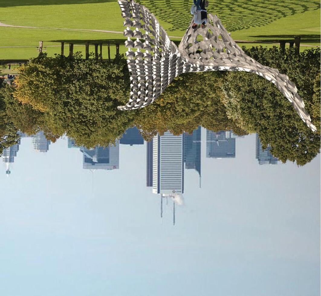 Given the choice to design a pavilion in any context, the Morph Pav ilion chose a city park as its setting. Using sur f ace modeling techniques in Rhino, the shape of the pavilion was stretched with corners pulled in differing direct ions while a hole was punched in the center to create a str uctural core as well as gathering spot. Prefabricated volumetric metal panels transition in shape from one corner of the surface to another as they morph from a diamond shape to a circle.