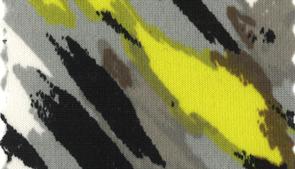 Green and Brown Design on Gold Polyester-Spandex Ribbed Knit 93% Polyester, 7% Spandex. 59” wide. Cold wash, dry low. All-over design. 90% crosswise stretch. 50% lengthwise stretch.