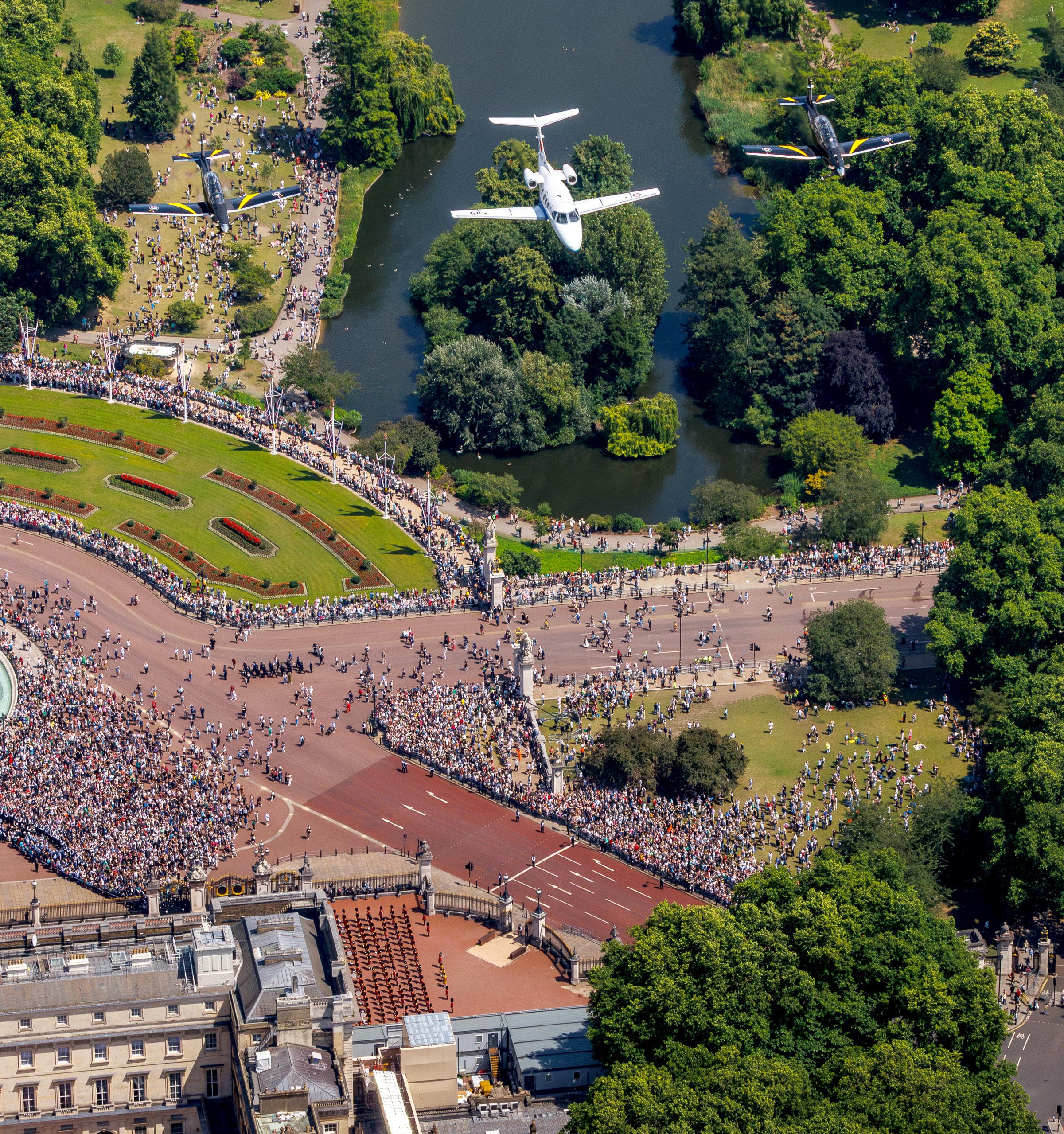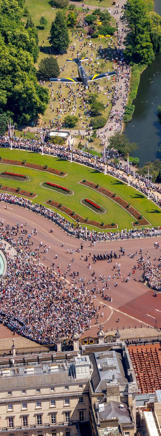 practice run ahead of the big day. During the flypast, 2 Texans flew in formation with a Phenom from RAF Cranwell, joining 26 other aircraft from across the RAF fleet as they soared above The Mall and Buckingham Palace, marking a moment of national pride and ceremony.