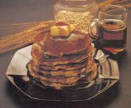 Second side is cooked when centre springs back. Put a dab of butter on cooked surface of several pancakes. Pile up so butter is between pancakes. Pour syrup over just before serving.