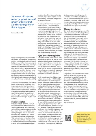 Netwerken als antwoord Aquaconcept daarentegen is een stabiel en financieel gezond bedrijf. Vooral z’n netwerk heeft volgens Raf Geudens een belangrijke rol gespeeld in de succesvolle ontwikkeling ervan. ‘Als jonge ondernemer stond netwerken voor mij aanvankelijk gelijk aan trachten te verkopen. Dat is totaal fout. De markt verandert voortdurend en de toekomst inschatten, is altijd lastig. Daarvoor moet je wel klanten en leveranciers zien en hen volop vragen stellen. Door contacten met anderen in het bedrijfsleven achterhaal je ook hoe het in andere sectoren loopt. Het zakencijfer van een goed bevriende ondernemer die met z’n bedrijf voorbereidende bouwwerken uitvoert, is bijvoorbeeld een goede barometer voor de toekomst van mijn segment. Regelmatig je voelsprieten uitsteken, is belangrijk om je daarvan een juist beeld te vormen’, haalt hij aan.