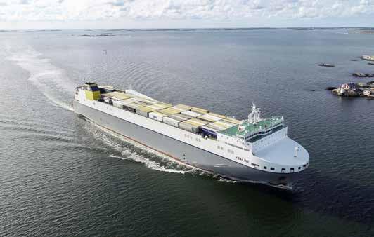 het volume van de cyclische papiersector. Daarom richtten we ons vanaf 2015 ook op andere cargo zoals trailers, tankcontainers, auto’s, high & heavy-machines en projectlading. De grote marktvraag leidde sinds 2020 naar een samenwerking met het Deense DFDS. Wekelijks varen één schip van DFDS en één van ons samen 4 rotaties. Wij doen dat telkens met een schip van onze H5-klasse, met 5.000 lijnmeter ons op één na grootste type. We koppelden de lijn Zeebrugge-Göteborg aan een netwerk van bestemmingen zoals Ierland, de economische groeipolen Spanje en Portugal en het Deense Esbjerg. We combineren telkens diverse types onbegeleid cargo, met zo veel als mogelijk aan- en afvoer via het spoor.