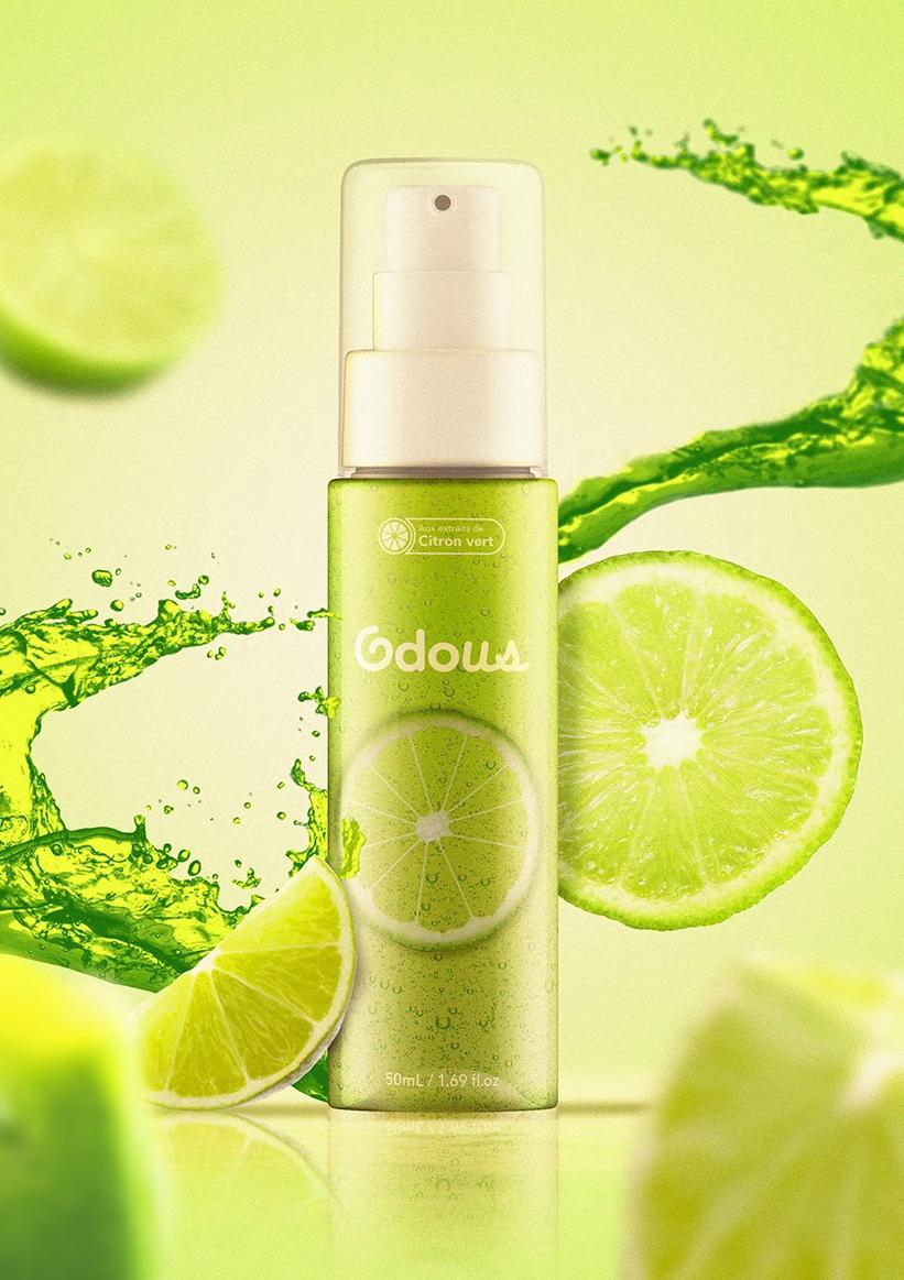 Odous se distingue par un packaging créatif qui exploite la transparence du flacon : à mesure que le produit est utilisé, la rondelle d’agrume représentée sur le flacon se vide progressivement, illustrant ainsi l’extraction des agents actifs présents dans les agrumes.