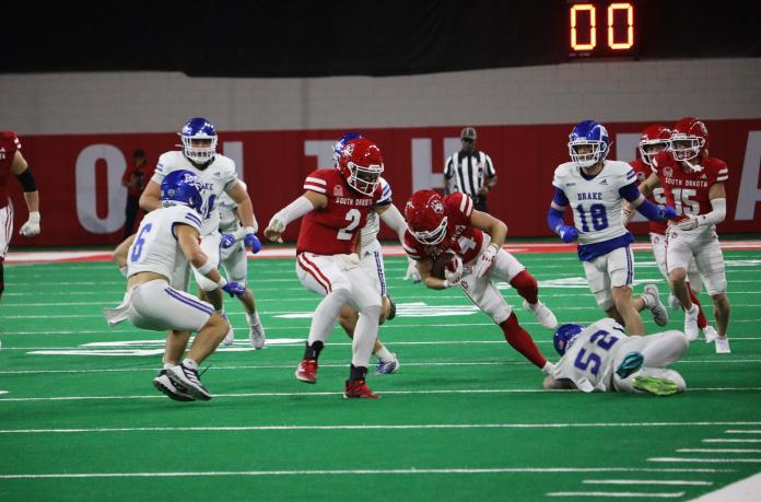 Following the opening score, the Coyotes stopped Drake, and later in the opening quarter of play, scored again. On a five-play, 58-yard drive, Travis Theis took the handoff 25 yards for the touchdown, and Will Leyland made it 14-0 in favor of USD.