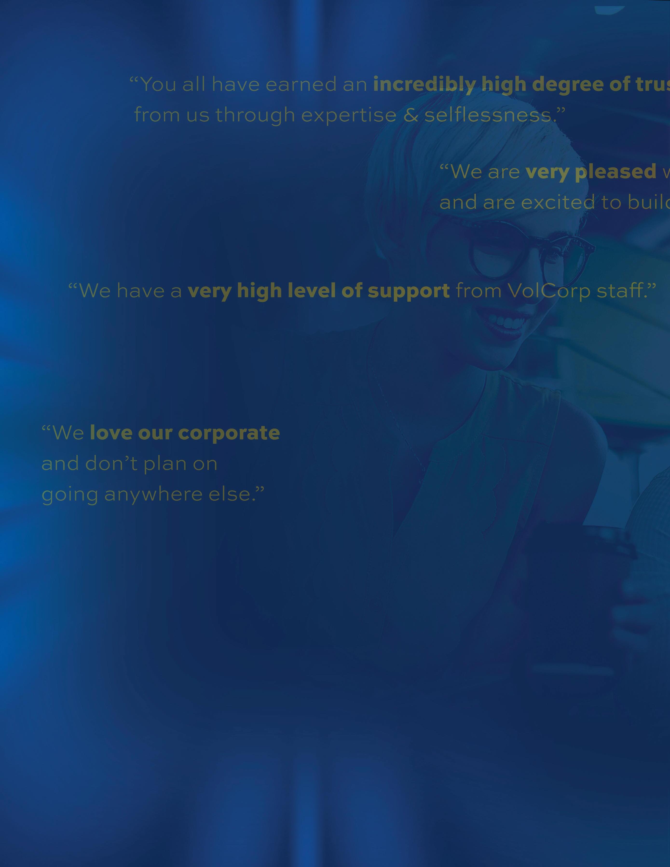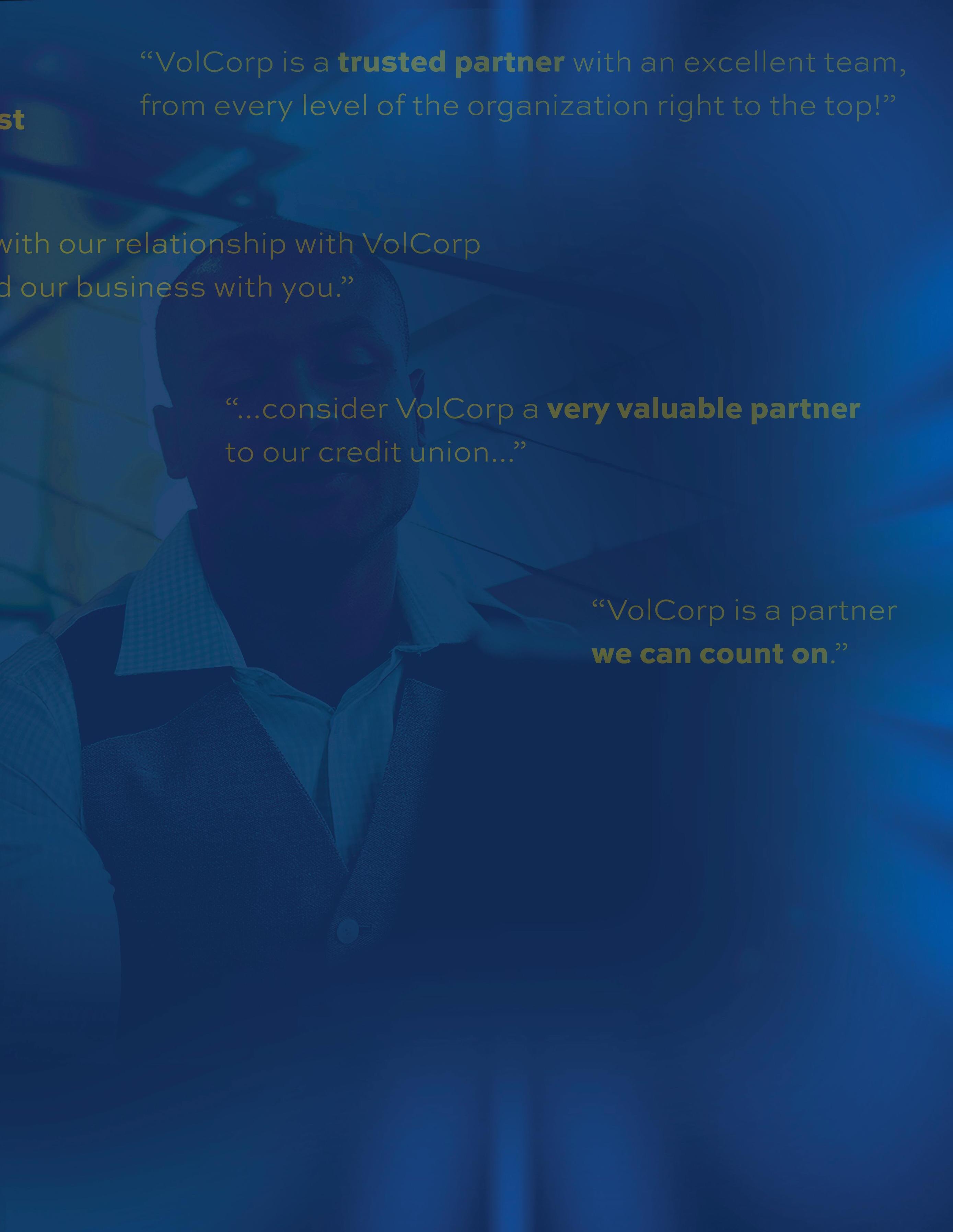 partner, not just a vendor.We are still working, and we still want to keep that trust.Thank you for le ing us do what we do for you and thank you for makingVolCorp a special place doing special things for special people…you and your members.