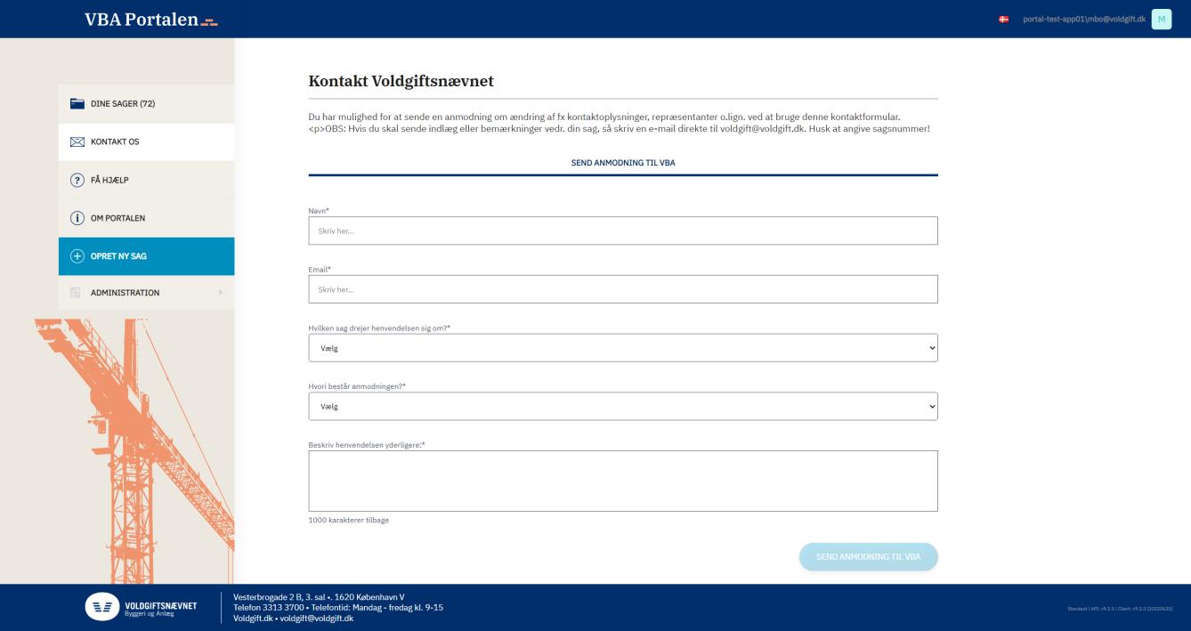 I venstremenuen er der en kontaktformular, som kan bruges til at kontakte Voldgiftsnævnet om praktiske spørgsmål vedr. dine sager på VBA Portalen. Oplysninger på en sag i portalen, herunder parter, navne, adresser, telefonnumre, e-mails mv, kan kun rettes af Voldgiftsnævnet.