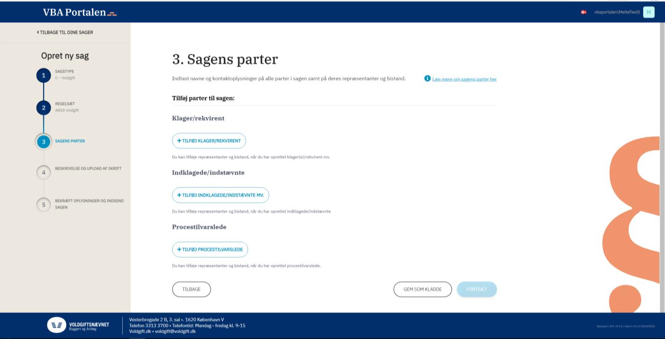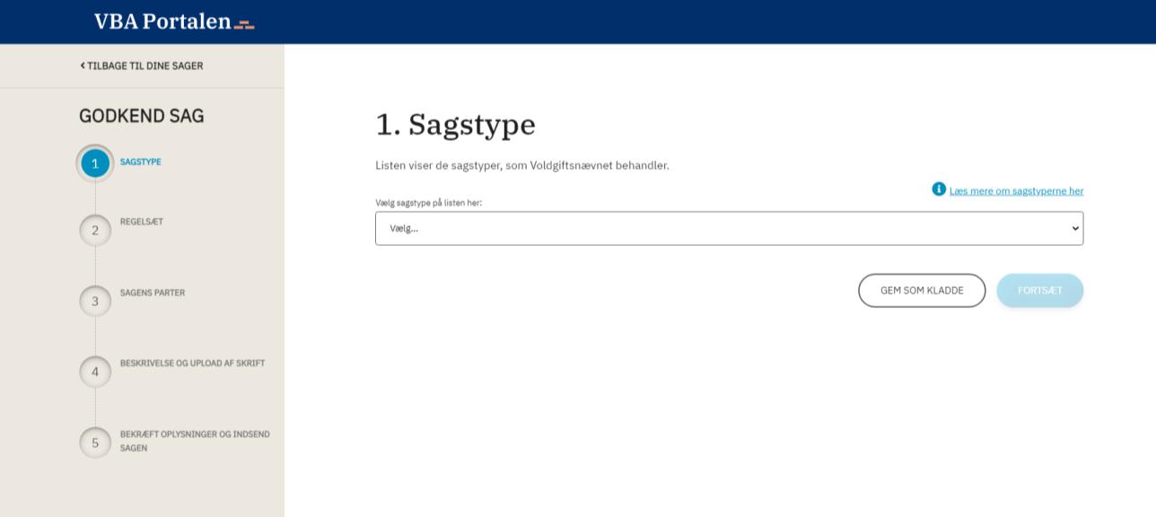 VIGTIGT – gem undervejs: For at undgå at miste allerede indtastede data, bør funktionen ’Gem som kladde’ bruges løbende under sagsoprettelsen (specielt efter indtastning af sagsparter på trin 3).