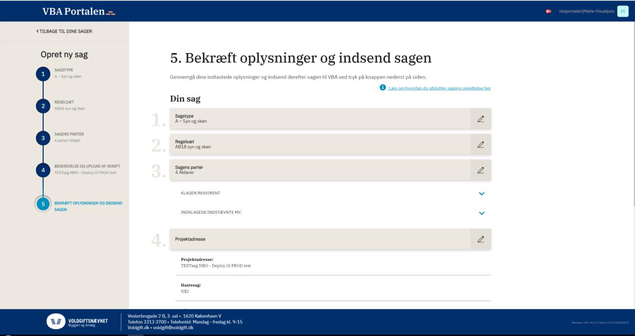 På sidste trin af sagsoprettelsen gennemgås de indtastede oplysninger. Hvis du ønsker at rette noget, så klik på blyantsikonet ud for det pågældende felt. Når du har rettet, så husk at klik ’Gem som kladde’ inden du igen forlader den side/det trin, hvor du retter. Derefter kan du se rettelsen i oversigten på trin 5.