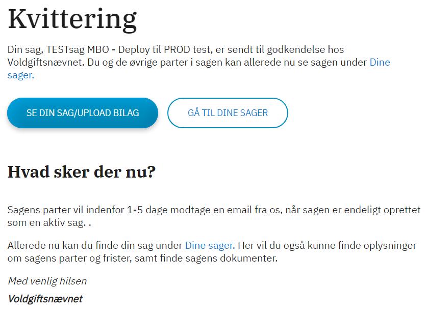 Kvitteringen er en bekræftelse på, at sagen er indsendt til VBA. Alle partsrepræsentanter og bistand, som er oprettet på sagen, får straks en automatisk e-mail om, at der er en ny sag på VBA Portalen.