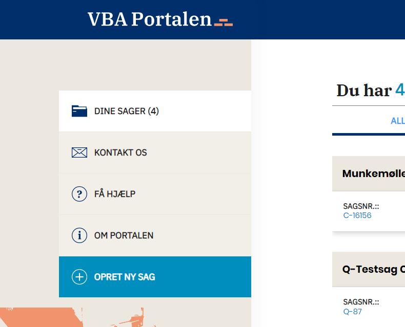 Når du er logget på, kommer du direkte til oversigten over dine sager i VBA Portalen