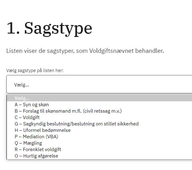 Allerførst vælger du sagstype i drop downmenuen, som viser de 9 sagstyper Voldgiftsnævnet behandler.