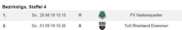 DJKFVHaaren - SpartaGerderathFVVaalserquartier - RasensportBrand SVRott - Germ.Lich/SteinstraßFCRoetgen - AlemanniaMariadorf Conc.Oidtweiler - SGStolbergColumbiaDonnerberg - FCWegberg/Beeck 1.FCHeinsberg/Lieck - UnionWürm/LindernTuSRhld.Dremmen - Germ.Eicherscheid 1.Spieltag25.08.20193.Spieltag08.09.2019 UnionWürm/Lindern - TuSRhld.Dremmen 2 : 0 UnionWürm/Lindern - ColumbiaDonnerberg FCWegberg/Beeck - 1.FCHeinsberg/Lieck 5 : 2 FCWegberg/Beeck - Conc.Oidtweiler SpartaGerderath - SVHelpenstein 1 : 1 SpartaGerderath - FCRoetgen AlemanniaMariadorf - DJKFVHaaren 2 : 1 FVVaalserquartier - TuSRhld.Dremmen SGStolberg - ColumbiaDonnerberg 8 : 1 SGStolberg - SVHelpenstein Germ.Eicherscheid - FVVaalserquartier 2 : 1 Germ.Eicherscheid - 1.FCHeinsberg/Lieck RasensportBrand - FCRoetgen 0 : 3 RasensportBrand - AlemanniaMariadorf Germ.Lich/Steinstraß - Conc.Oidtweiler 5 : 0 Germ.Lich/Steinstraß - DJKFVHaaren DerletzteSpieltag DernächsteSpieltag DeraktuelleSpieltag(2.Spieltag)