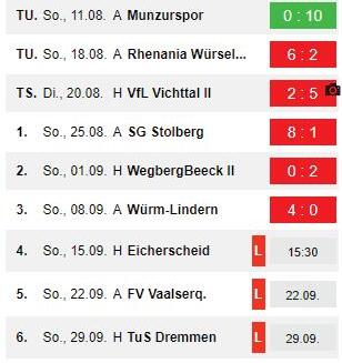 Germ.Lich/Steintraß - AlemanniaMariadorfSGStolberg - FCRoetgen FCWegberg/Beeck - DJKFVHaarenGerm.Eicherscheid - Conc.Oidtweiler UnionWürm/Lindern - svHelpensteinRasensportBrand - SpartaGerderath FVVaalserquartier - ColumbiaDonnerbergTuSRhld.Dremmen - 1.FCHeinsberg/Lieck 4.Spieltag08.09.20196.Spieltag29.09.2019 DJKFVHaaren - SGStolberg 2 : 3 DJKFVHaaren - UnionWürm/Lindern SVHelpenstein - FCWegberg/Beeck 0 : 4 SVHelpenstein - Germ.Eicherscheid 1.FCHeinsberg/Lieck - FVVaalserquartier 4 : 0 Conc.Oidtweiler - FVVaalserquartier AlemanniaMariadorf - SpartaGerderath 3 : 0 1.FCHeinsberg/Lieck - RasensportBrand FCRoetgen - Germ.Lich/Steintraß 1 : 3 SpartaGerderath - Germ.Lich/Steinstraß ColumbiaDonnerberg - Germ.Eicherscheid 4 : 5 AlemanniaMariadorf - SGStolberg TuSRhld.Dremmen - RasensportBrand 2 : 2 FCRoetgen - FCWegberg/Beeck Conc.Oidtweiler - UnionWürm/Lindern 1 : 1 ColumbiaDonnerberg - TuSRhld.Dremmen DerletzteSpieltag DernächsteSpieltag DeraktuelleSpieltag(5.Spieltag)