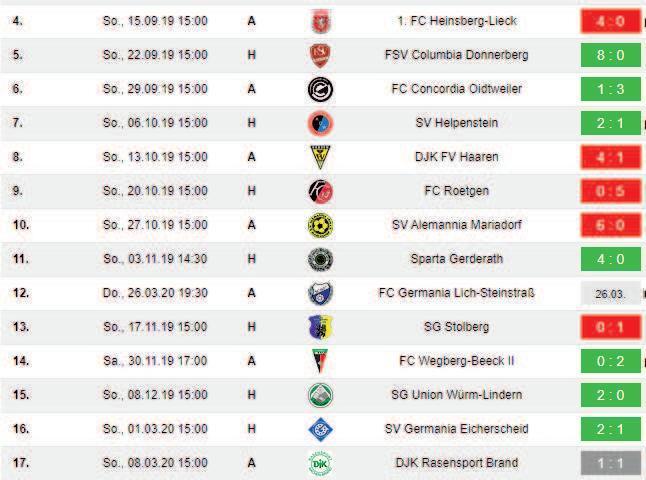 AlemanniaMariadorf - RasensportBrandFCRoetgen - SpartaGerderath Conc.Oidtweiler - FCWegberg/Beeck1.FCHeinsberg/Lieck - Germ.Eicherscheid SVHelpenstein - SGStolbergColumbiaDonnerberg - UnionWürm/Lindern DJKFVHaaren - Germ.Lich/SteintraßTuSRhld.Dremmen - FVVaalserquartier 17.Spieltag08.03.202019.Spieltag22.03.2020 SpartaGerderath - DJKFVHaarenFCWegberg/Beeck - SVHelpenstein FCWegberg/Beeck - ColumbiaDonnerbergUnionWürm/Lindern - Conc.Oidtweiler UnionWürm/Lindern - 1.FCHeinsberg/LieckFVVaalserquartier - 1.FCHeinsberg/Lieck AlemanniaMariadorf - FCRoetgenSpartaGerderath - AlemanniaMariadorf RasensportBrand - FVVaalserquartier 1 : 1 RasensportBrand - TuSRhld.Dremmen SGStolberg - Conc.Oidtweiler 5 : 1 SGStolberg - DJKFVHaaren Germ.Eicherscheid - TuSRhld.Dremmen 1 : 1 Germ.Lich/Steintraß - FCRoetgen Germ.Lich/Steintraß - SVHelpensteinGerm.Eicherscheid - ColumbiaDonnerberg DeraktuelleSpieltag(18.Spieltag) ausgef. ausgef. ausgef. ausgef. ausgef. DerletzteSpieltag DernächsteSpieltag