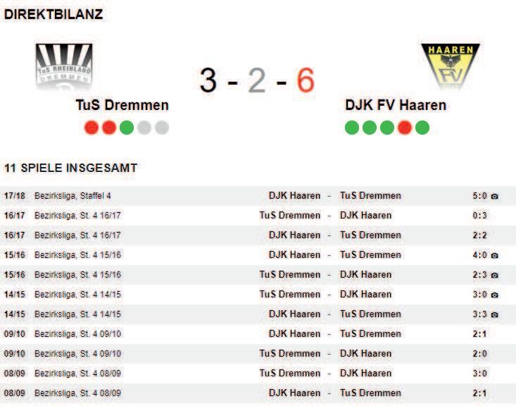 Die Zweite erwartet Concordia Haaren II. Haaren schob sich erstmals am zehnten Spieltag auf einen Aufstiegsplatz. Mit dem Sieg im Hinspiel gegen denTuS startete man eine Siegesserie, die bis zum heutigenTage anhält.Acht Siege am Stück holte dasTeam und hat nun, aufgrund einiger Patzer vonTabellenführer Ophoven, die besten Karten imAufstiegsrennen. Bei zwei Spielen wenigerkann man die drei PunkteRückstand noch aufholenund somit bald die Tabellenführung übernehmen. Wichtiger istaber derAbstand auf Platz drei,den ersten Nichtaufstiegsplatz. Hier hat das Team sechsPunkteVorsprung. DerTuSgeht dennoch optimistisch ins Spiel, denn im Hinspiel war man klar überlegen, verlor am Ende nur aufgrund der mangelhaften Chancenverwertung. Das ist bei Haaren definitiv nicht der Fall. Mit 59 erzieltenToren hat man die zweitmeisten der Liga. Die 22 Gegentore sind Ligabestwert. Offensiv ist Pascal Sentis und Khalil Chebbi sehr treffsicher. Noch besser macht es aberTim Wallrafen, der in nur vier Einsätzen satte neunTore erzielen konnte. Die Frage ist ob der ehemaligeTuSSpieler auch in Dremmen aufläuft oder nicht.