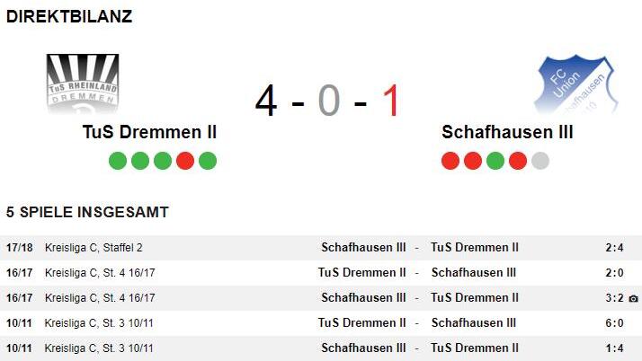 UnionSchafhausenistaufdembestenWegdieguten PlatzierungenindenletztenJahreninderC-Ligaauch indiesemJahrzuwiederholen.NachdemMeistertitel inderC-Liga2012unddemdirektenAbstiegimJahr danachlandetemanamEndederSaison immerzwischenPlatzvierundacht. AufeineähnlichePlatzierungwirdes auchindiesemJahrhinauslaufen. AktuellistmanFüntermitdreiPunkten RückstandaufdenTuS,deraufPlatz viersteht.AusdenletztenfünfSpielen holteSchafhausendreiSiegeundein Remisundverlorlediglichgegen TabellenführerConcordiaHaaren.Bei Schafhausenhängtvielesdavonabwiedieoberen Mannschaftenaufgestelltsindundobdiese MannschaftenauchimEinsatzsind.Sokonntedie DrittebeimSpielgegenTabellenführerOphovenauf dieerfahrenenThomasLiebens(1.Mannschaft)und MersadMukic(2.Mannschaft)zurückgreifen,was sichdannauchamErgebniswiderspiegelt.DasSpiel wurdeklarmit4:1gewonnen.ImletztenJahrkonnte