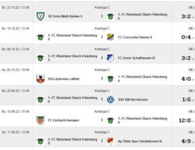 2017 meldete der 1.FC Rheinland/ÜbachPalenberg seine 2. Mannschaft für den Spielbetrieb an. Seit dem ging es fast stetig bergauf.ImerstenJahrgelanggleichderAufstieg in die Kreisliga C. Dort landete man in den bisherigen Spielzeiten immer im gesicherten Mittelfeld und musste sich nieSorgenumdenAbstieg machen. Dies wird in diesem Jahr anders sein. Nach dem 10. Spieltag ist das Team Tabellenletzter und konnte bis jetzt immer noch nicht die 6 Strafpunkte ausgleichen und hat aktuell Minus 3 Punkte auf dem Konto. Aufgrund von zwei Spielen die man im Vorjahr nicht angetreten ist musste man für jedes diese Spiele mit drei Minuspunkten in die Saison gehen. Unabhängig