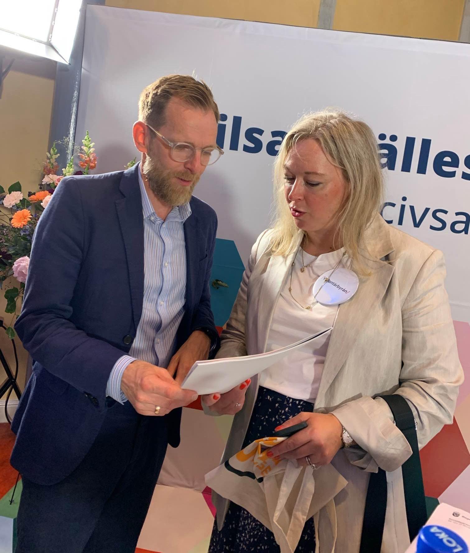 Volontärbyråns verksamhetsledare Anna Snell lämnar över rapporten ”Volontärinsatser i välfärden” till socialminister Jakob Forssmed under Almedalsveckan 2023.