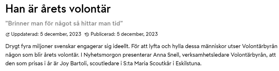 2023 gick till Joy Bartoli från S:ta Maria Eskilstuna Scoutkår. Årets volontär och Volontärbyråns