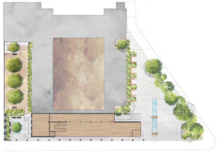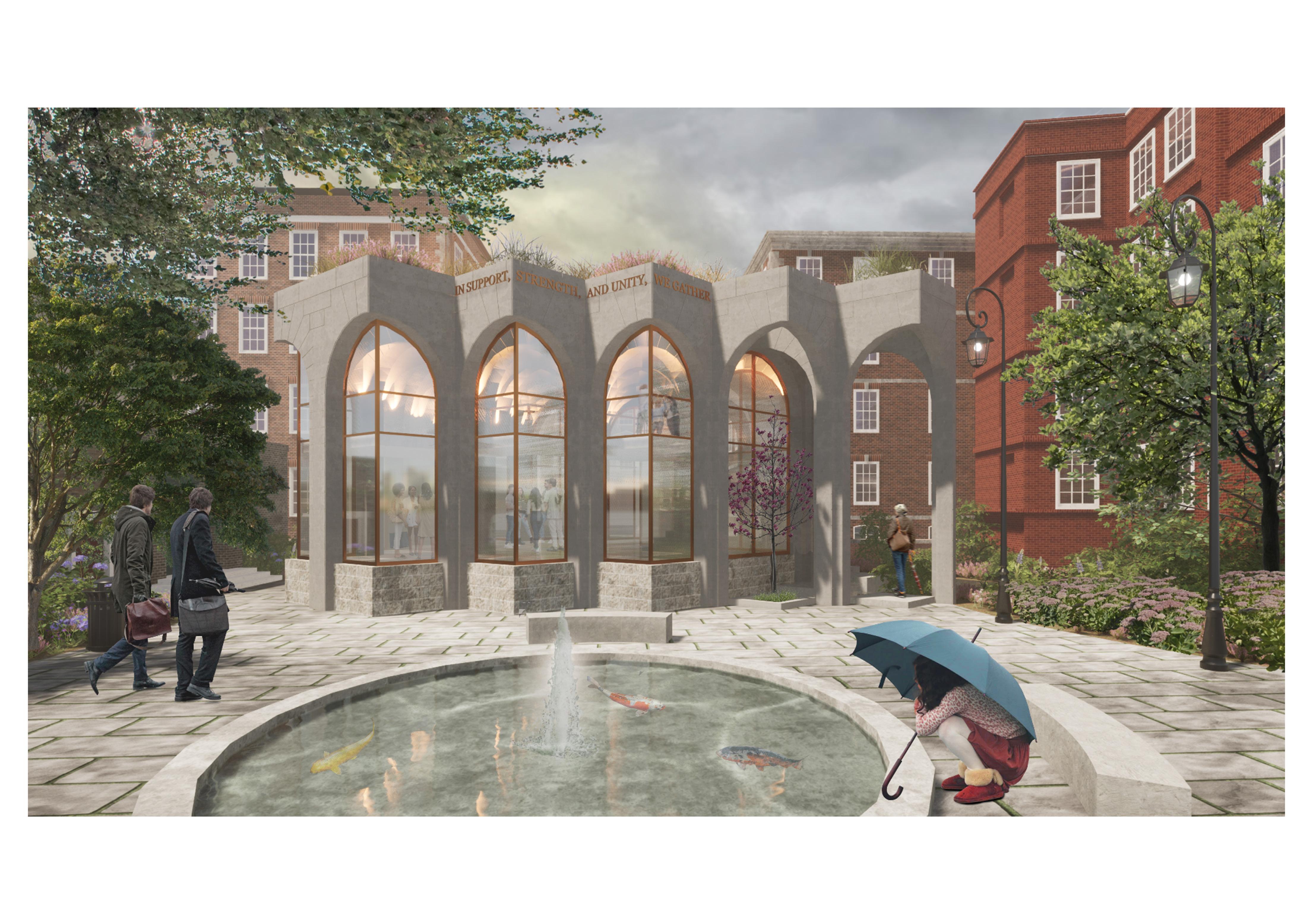 Concept: Temple Passage was inspired by the fusion of different architectural styles and eras around London. The design explores the expressionist opportunities of the structure that occur from breaking a classical arch in half, resulting in a dynamic diamond structural unit that changes according to the observer’s perspective. The repeating diamond structural unit dissipates as the building integrates into the gardens on the east side of the building. Integrated into the threshold between the gardens and the building is a passageway allowing pedestrians to enter the Middle Temple Gardens.