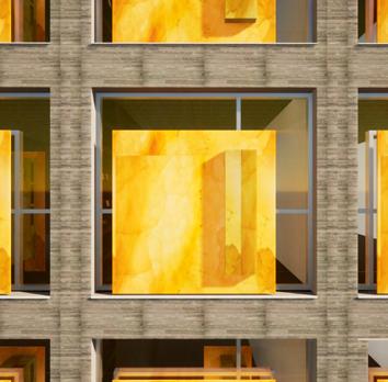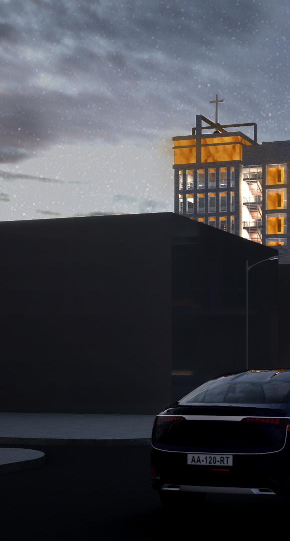 Concept: The urban monastery is centered around a strategic relationship between the sun and the building’s signature material, onyx doré. In the intersection between the two, three scales within the building become apparent: the human scale within the individual cells, the street scale within the church, and the urban scale in the tower. The three special locations of onyx not only call to each other in composition but also highlight the monastery’s spaces of prayer.