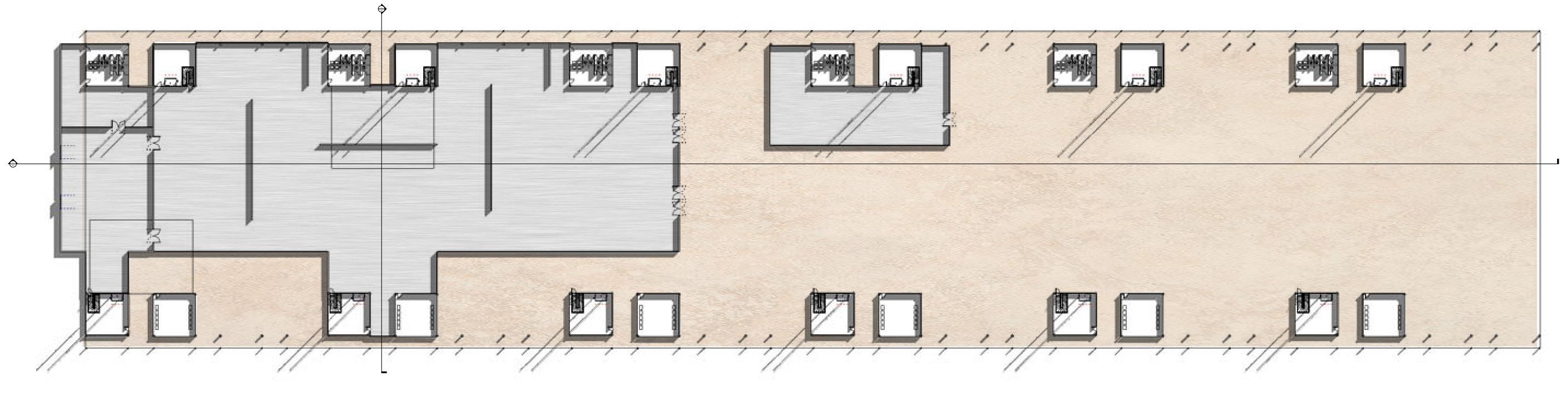 A structural breakdown of the wall system exposes contents that allow for natural lighting such as the clerestory that wraps around the entire building. The roof system is pitched for stormwater drainage purposes.