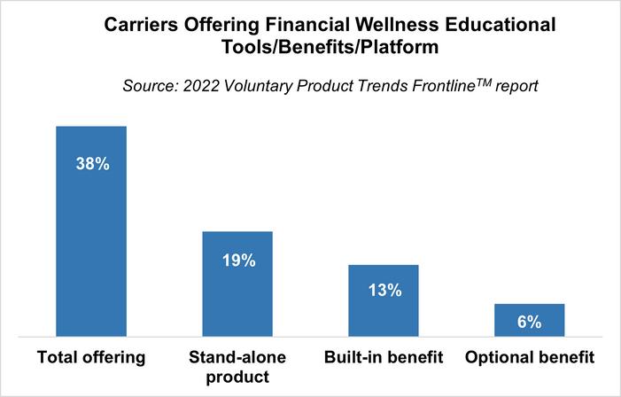 Carriers are supporting this trend of making financial wellness benefits more available. It’s the second-most common nontraditional benefit they offer, tied with identity theft protection and trailing only mental health benefits, according to our 2022 “Voluntary Product Trends” Frontline report. In fact, carriers surveyed say they offer this benefit at levels similar to more traditional Voluntary Benefits such as vision and cancer. It’s also by far the most common nontraditional benefit offered as a stand-alone product, rather than built-in or optional as part of another product.
