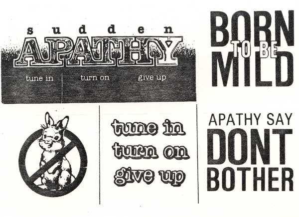 Thanks for Eyeballing our vintage SUDDENAPATHY merch If you can be arsed, say Hi to the editor, Cedric Sang-Froid: https://twitter.com/SuddenApathy suddenapathy@gmail.com Listen to Sudden Apathy tuneage on Soundcloud https://soundcloud.com/sudap