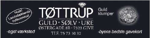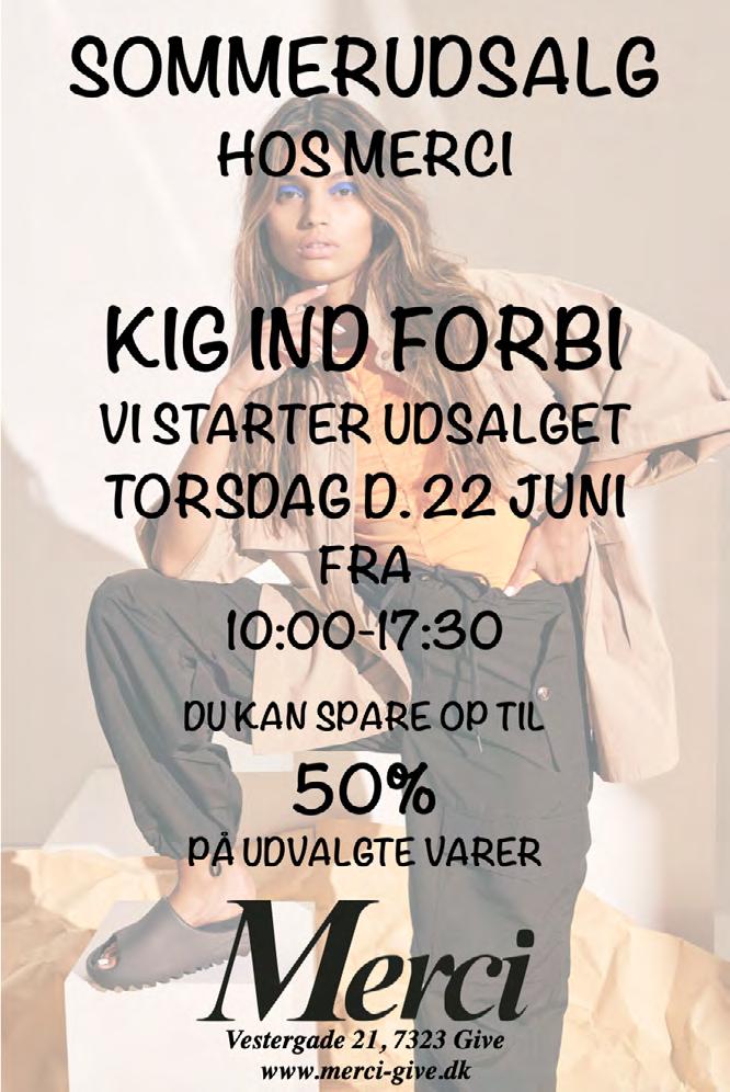 Læs mere side 4. Repræsenterede Give på TV på fornem vis Uge 26 – 2023 Heidi har fået en rigtig god start med Give Bog & Leg. Side 2 Franks foredrag åbner døre til både sindets mørkekammer og livets store gaver. Side 6–7 Endelig! Så fik Give sin café i midtbyen. Side 9 SPAR 25% påkvalitetsprodukter fra Faber Gardinbussen kommer hjem til dig! Engmarksvej 2, Lerager, 7323 Give info@engmarkis.dk · mobil: 4092 6055 Åbningstider: Fredag, lørdag og søndag kl. 12-16 eller efter aftale hele ugen Skønne økologiske produkter fra jerseykøer Engmarkis Givskud Fodbolgolf Engmarksvej 2, Givskud birgit@engmarkis.dk mobil: 23610117 Åbningstider: April-oktober hver dag kl. 8-21 Givskud Fodboldgolf Sommer ferie Go’ sommer! E-avisen på Vores LokalAvis er gået på sommerferie og er retur igen MANDAG DEN 31. JULI HUSK at der stadig kan læses nyheder hver dag på www.voreslokalavis.dk StærktSusanne!