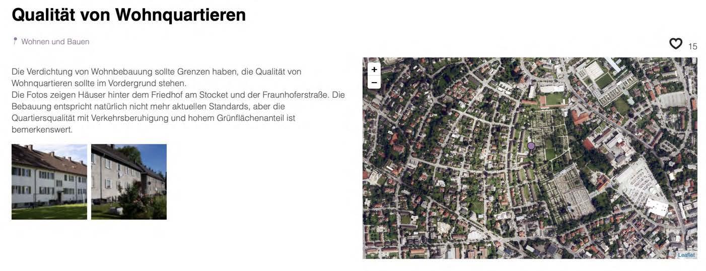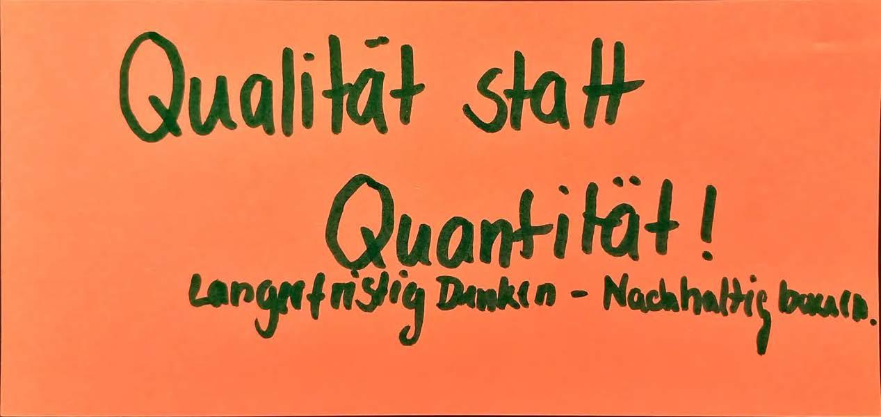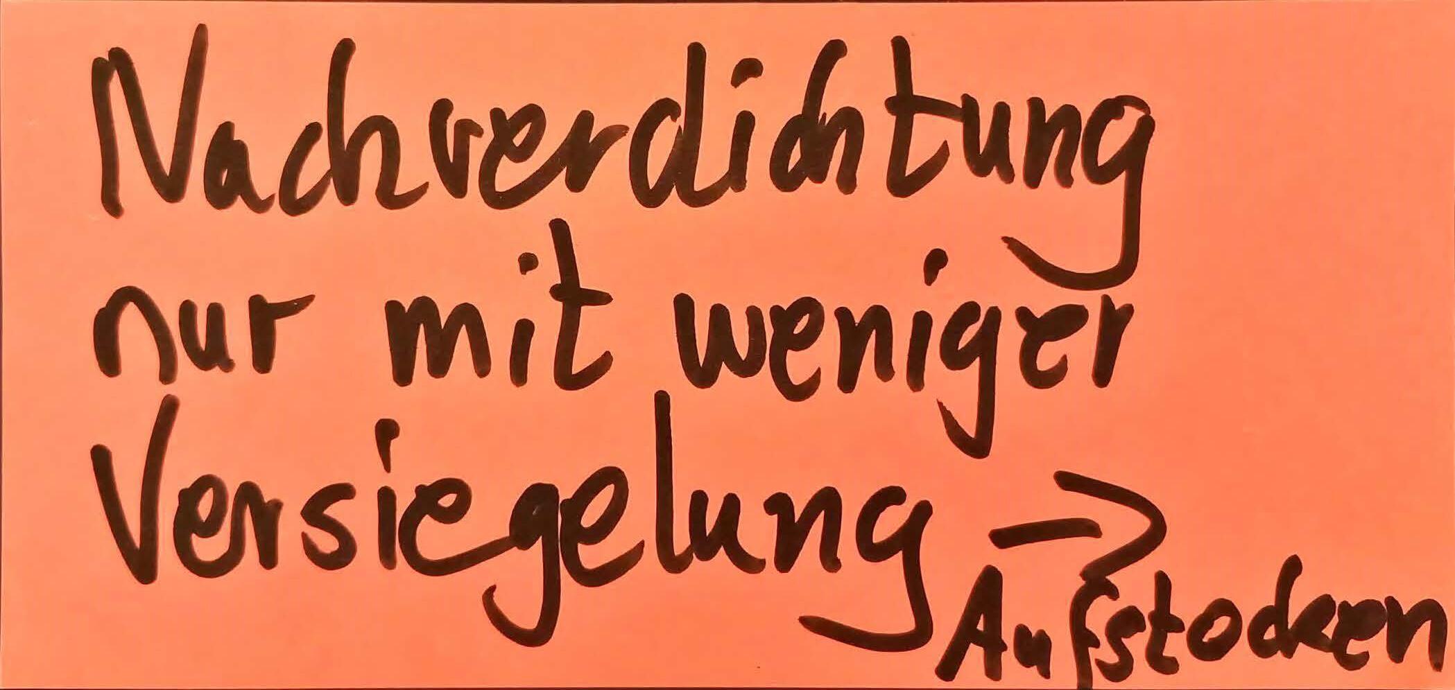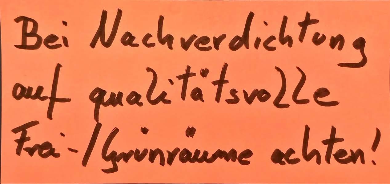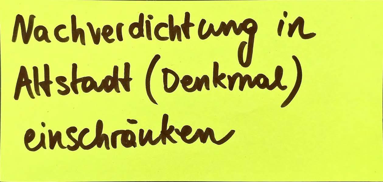 Im Kontext der Wachstumsregion und des Wohnraumbedarfs wurden auch viele Beiträge zum Thema Bestandsentwicklung und Nachverdichtung eingebracht. Nachverdichtung wird zum einen allgemein als Lösung zur Deckung von Raumbedarfen gesehen, dabei wird eine maßvolle und qualitätvolle Entwicklung gefordert. Spezifischer wird auch die Förderung von Umbau und Sanierung bestehender Gebäude als Maßnahmenvorschläge genannt.