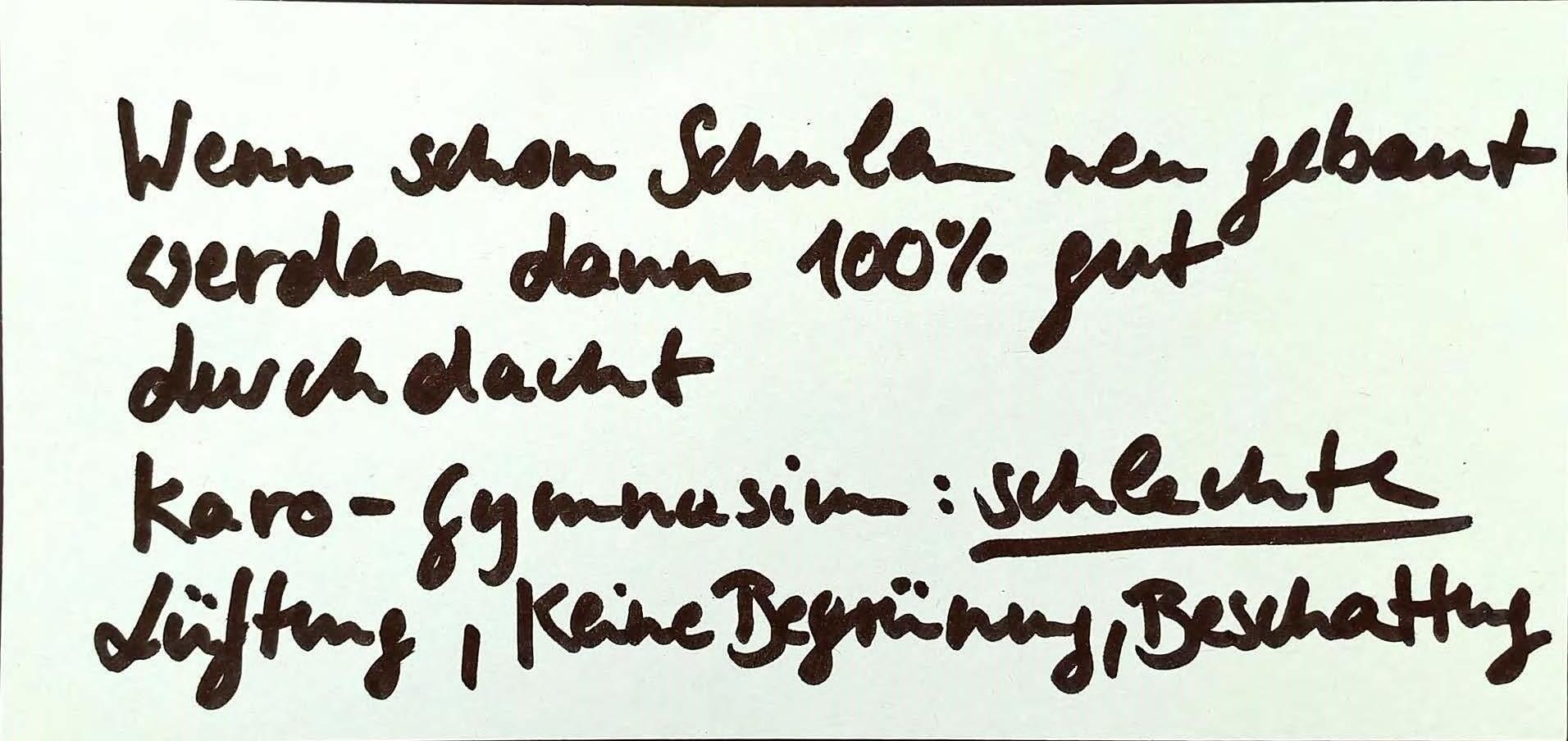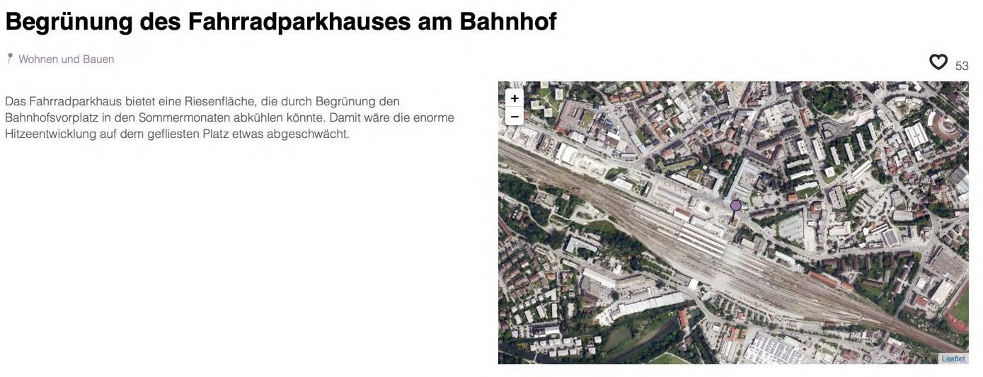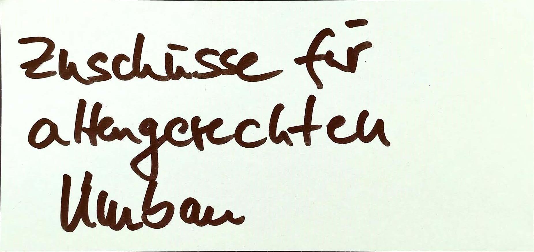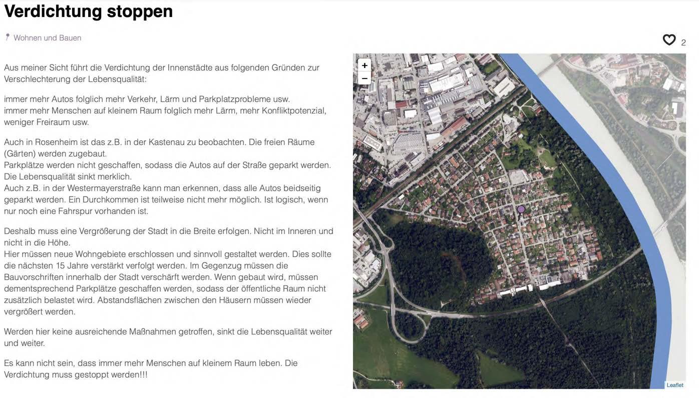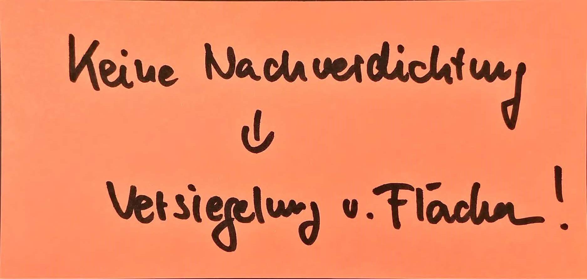 Im Kontext der Wachstumsregion und des Wohnraumbedarfs wurden auch viele Beiträge zum Thema Bestandsentwicklung und Nachverdichtung eingebracht. Nachverdichtung wird zum einen allgemein als Lösung zur Deckung von Raumbedarfen gesehen, dabei wird eine maßvolle und qualitätvolle Entwicklung gefordert. Spezifischer wird auch die Förderung von Umbau und Sanierung bestehender Gebäude als Maßnahmenvorschläge genannt.