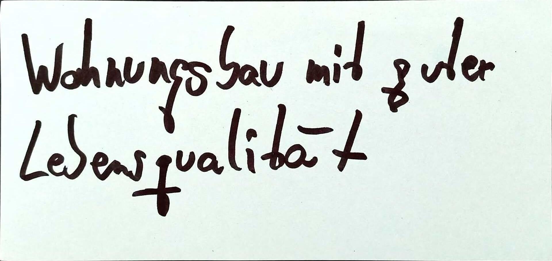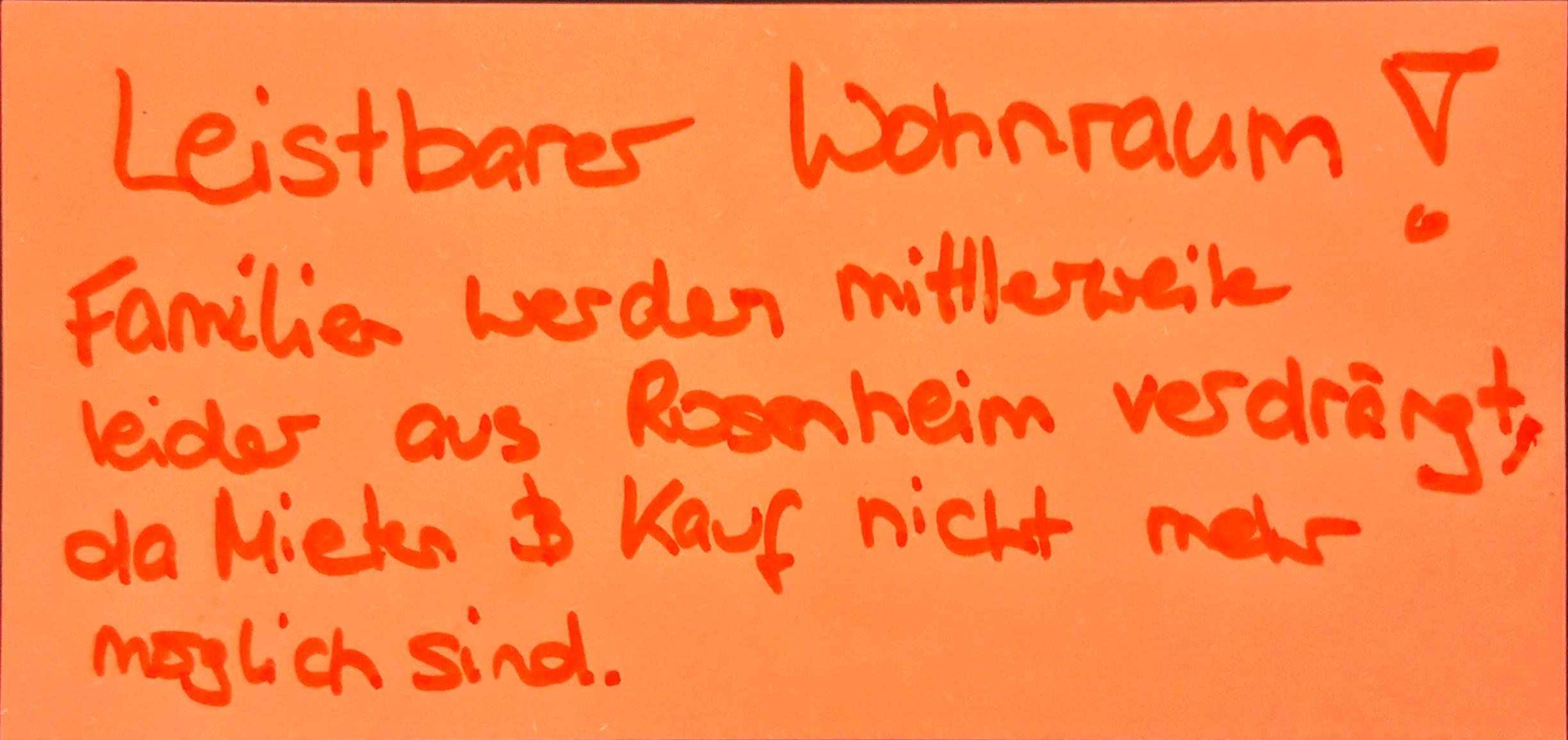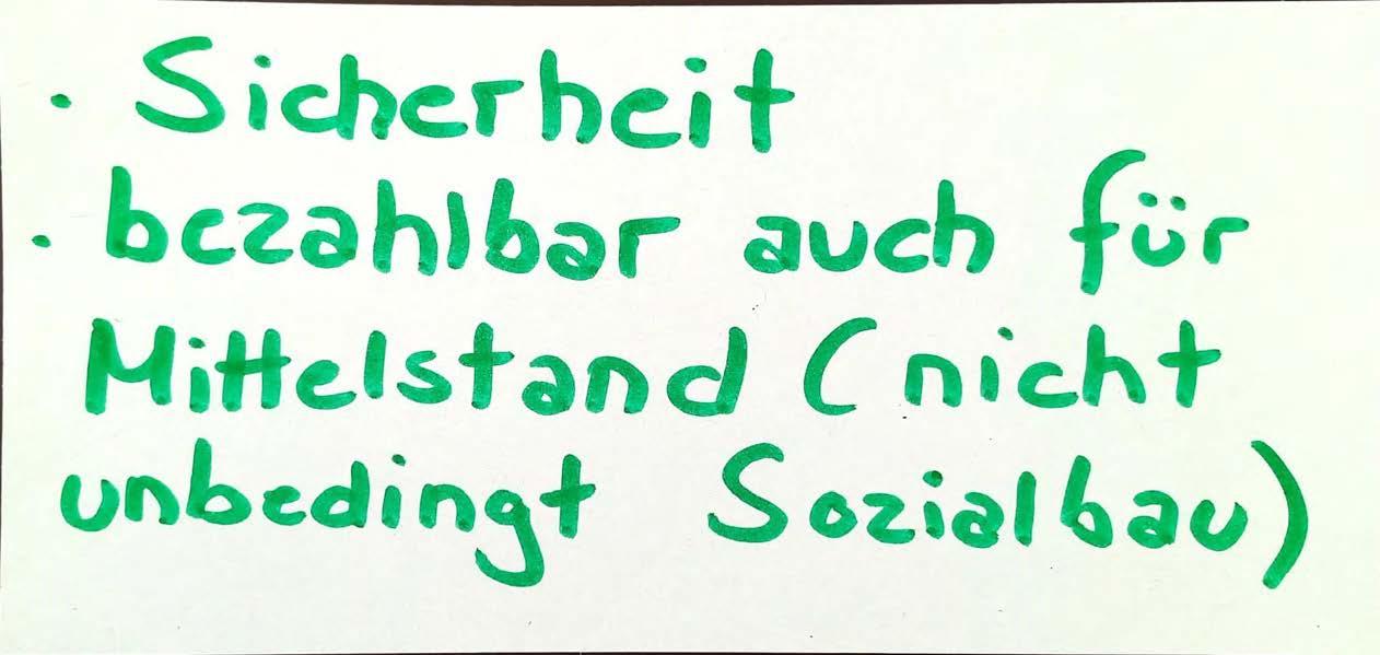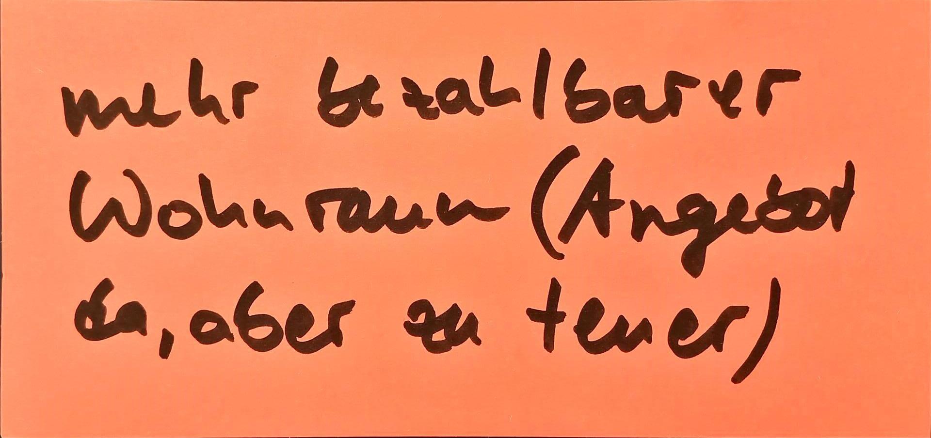 Ein mehrfach eingebrachtes Thema ist das Angebot von leistbarem Wohnraum, dazu zählt auch die allgemeine Versorgung mit Wohnraum. Dabei werden in mehreren Beiträgen bestimmte Zielgruppen, wie Familien, Mittelstand und Einheimische genannt, für die insbesondere bezahlbarer Wohnraum gefordert wird.